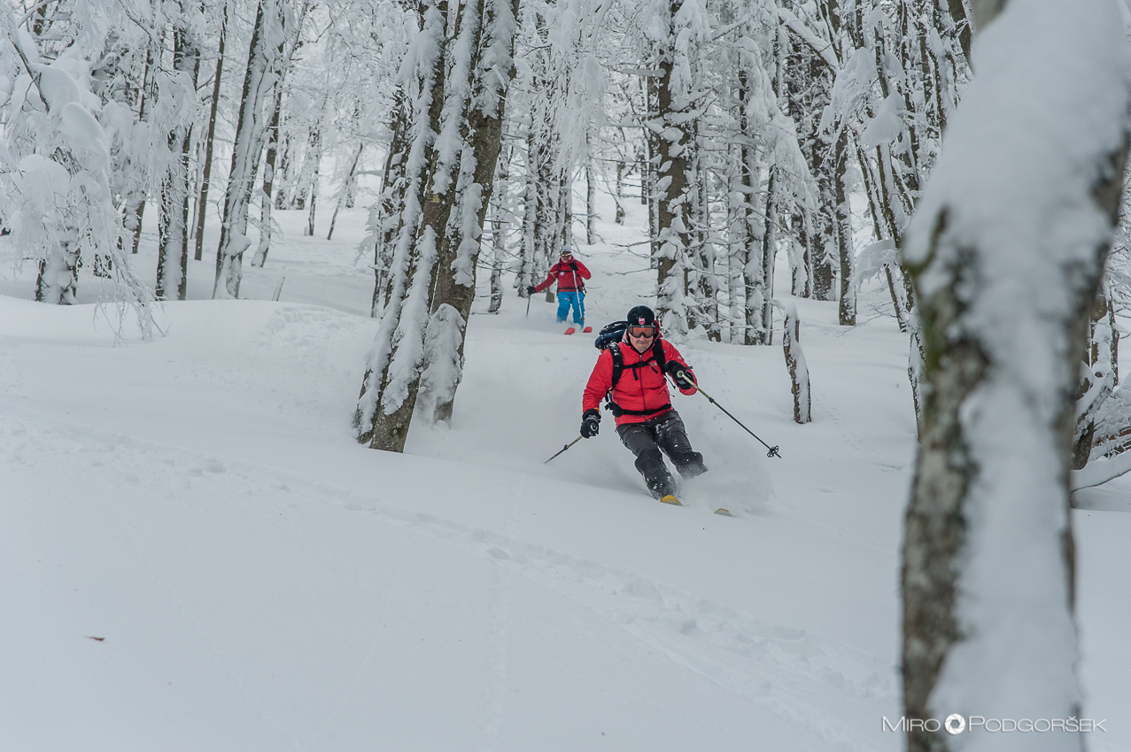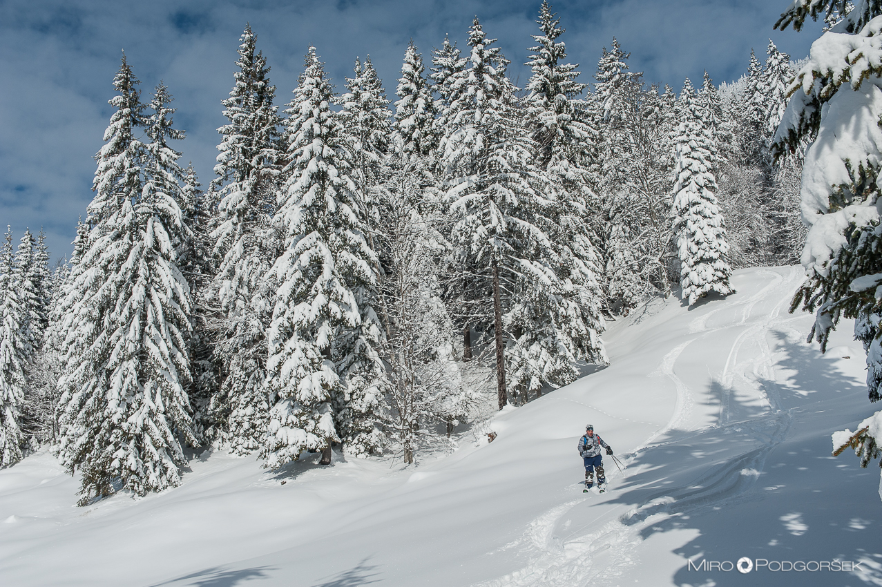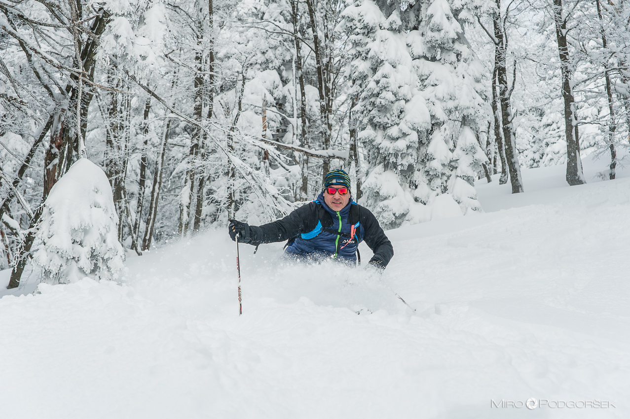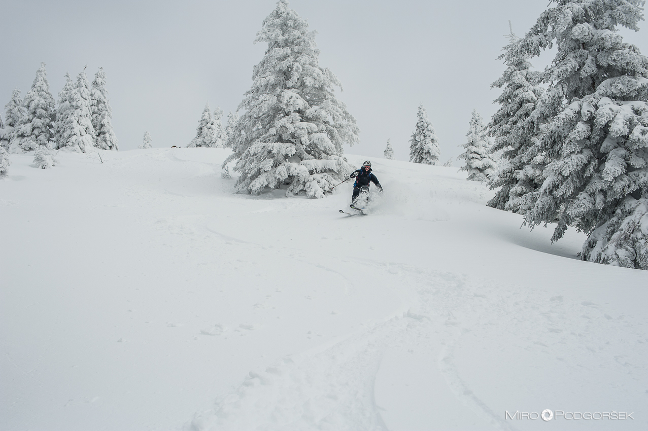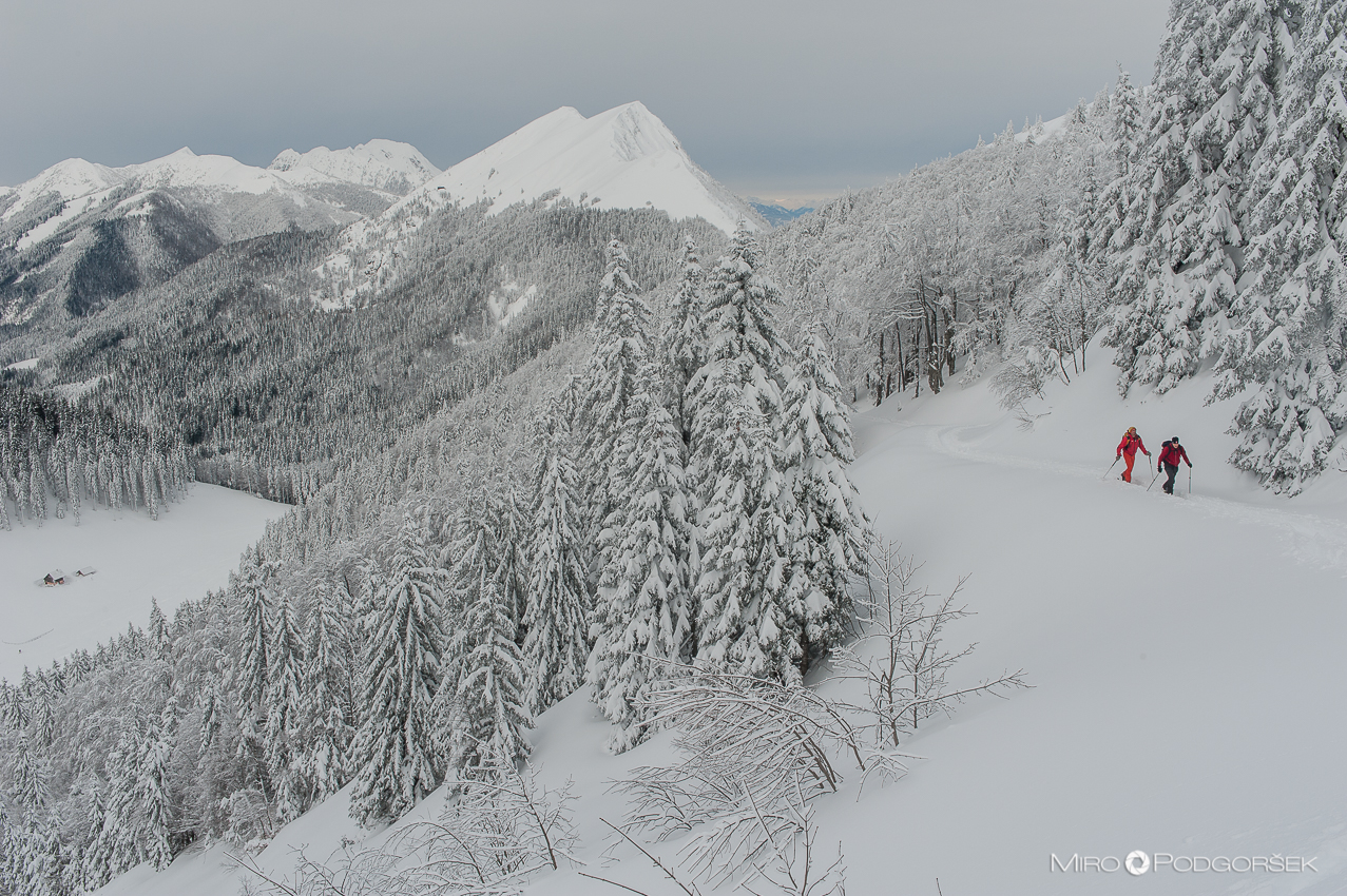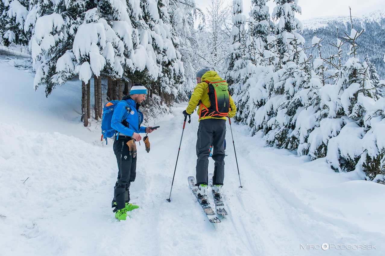 Že v petek sva z Juretom med obilnim sneženjem in gaženjem v Španov vrh premlevala možnosti, kam se podati v nedeljo, da bo tura varna, obenem pa bo nudila dovolj smučarskih užitkov.