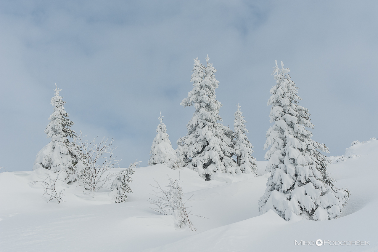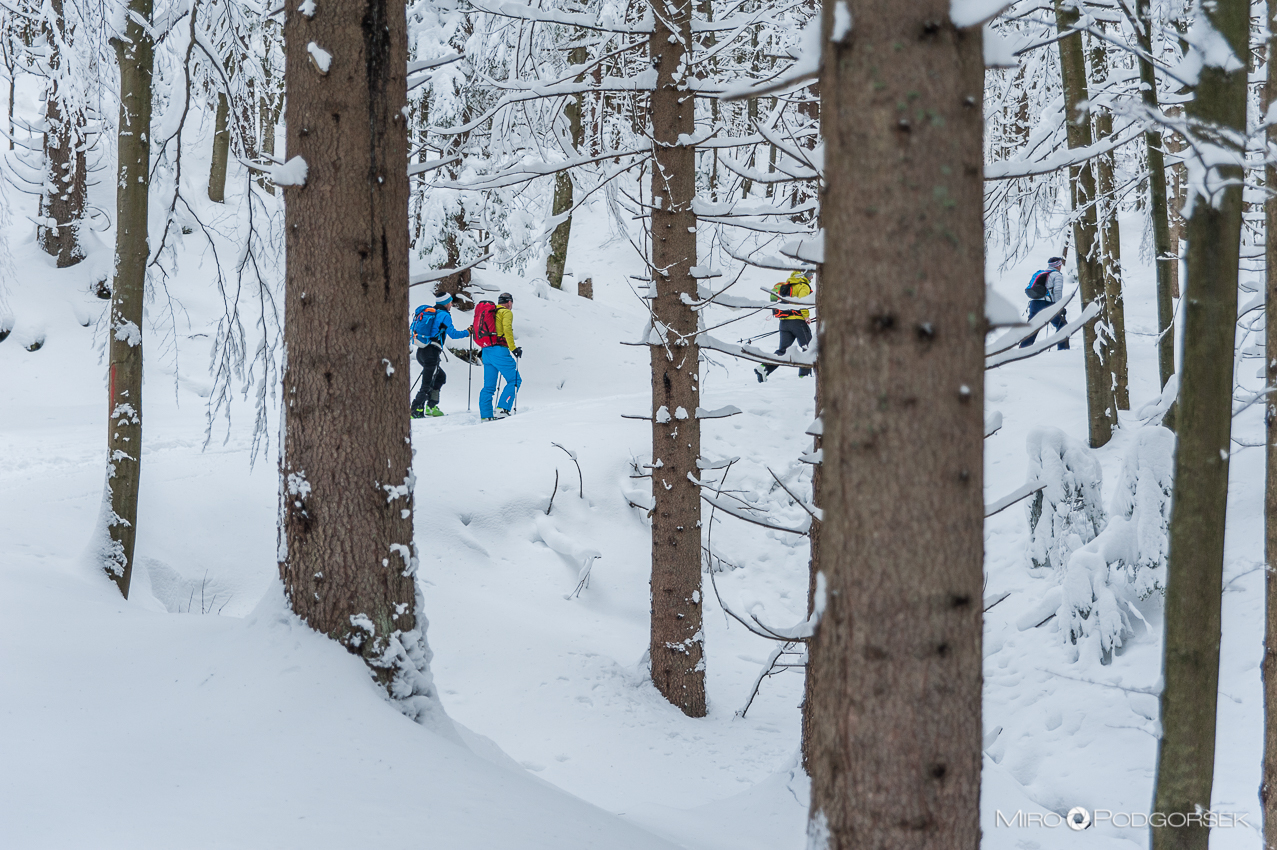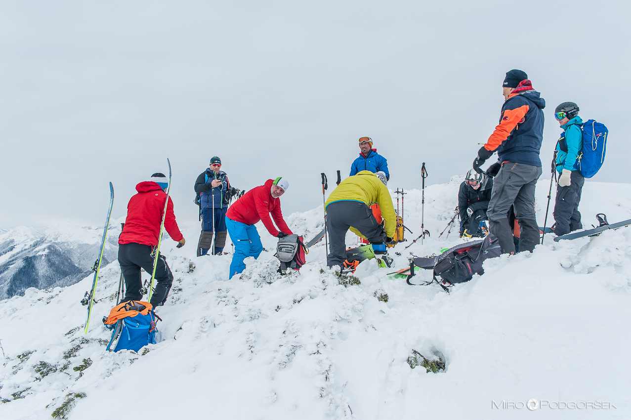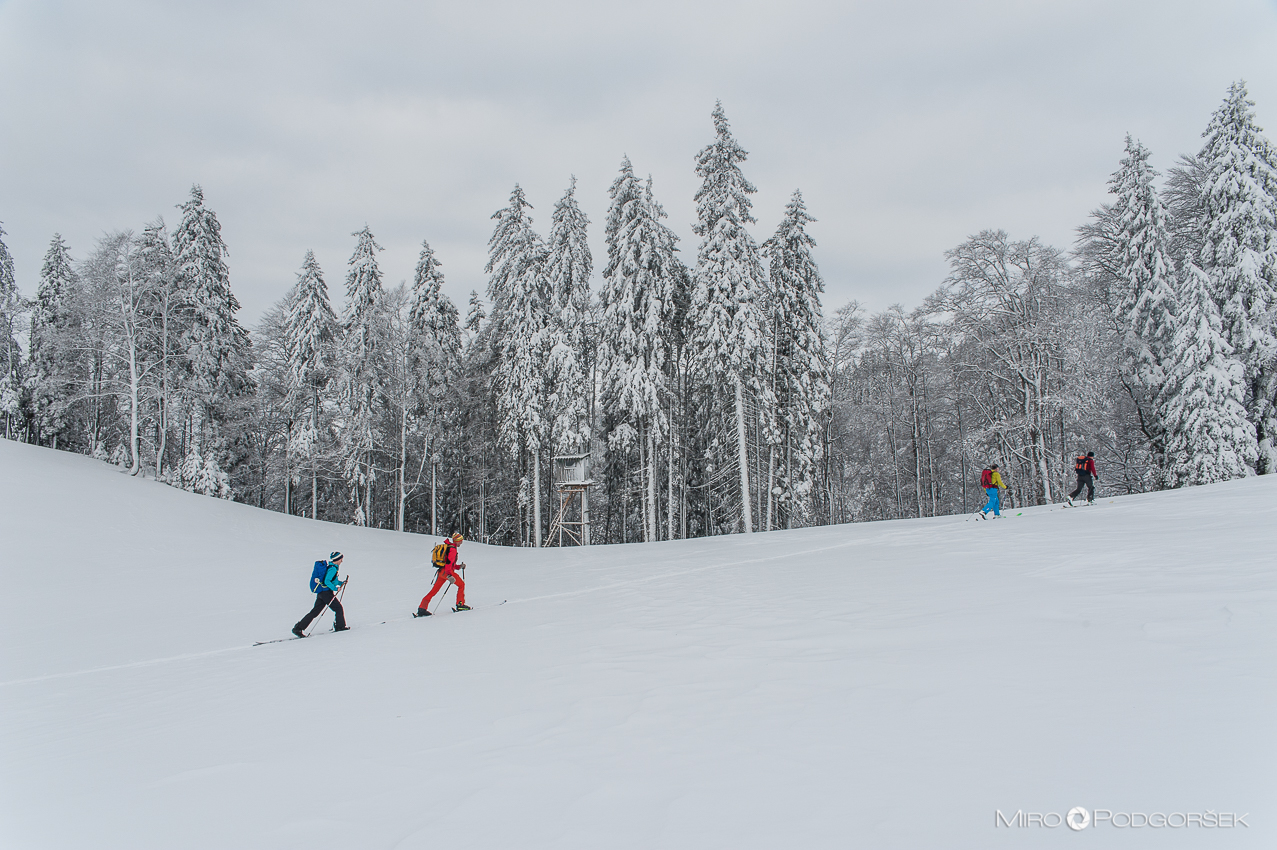 Na nedeljsko jutro se nas nabere devet. Grega, Jože, Andrej, Maša, Jure, Dani, dva Janeza in jaz. En avto pustimo pri Trilobitu, z ostalimi pa se zapeljemo po cesti proti Križevcu (200 metrov višje od Pristave, do koder je pluženo).