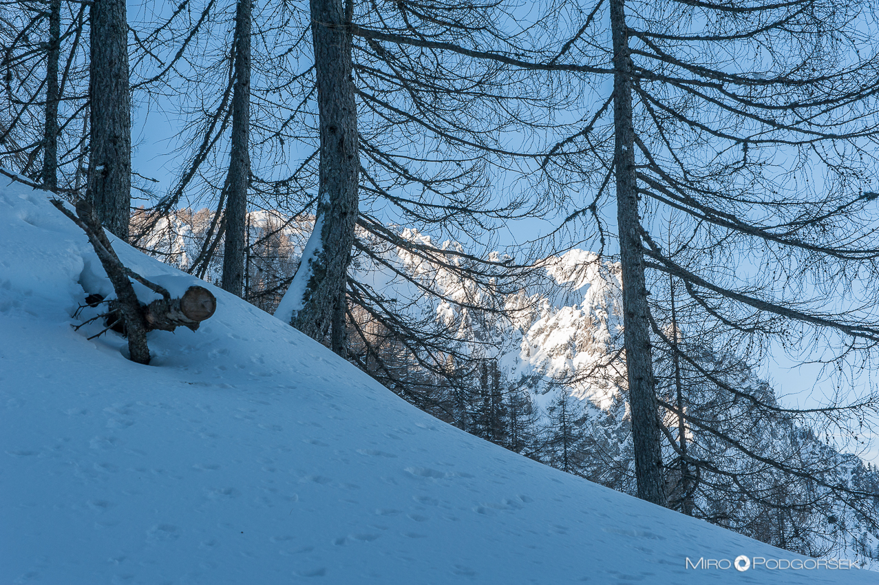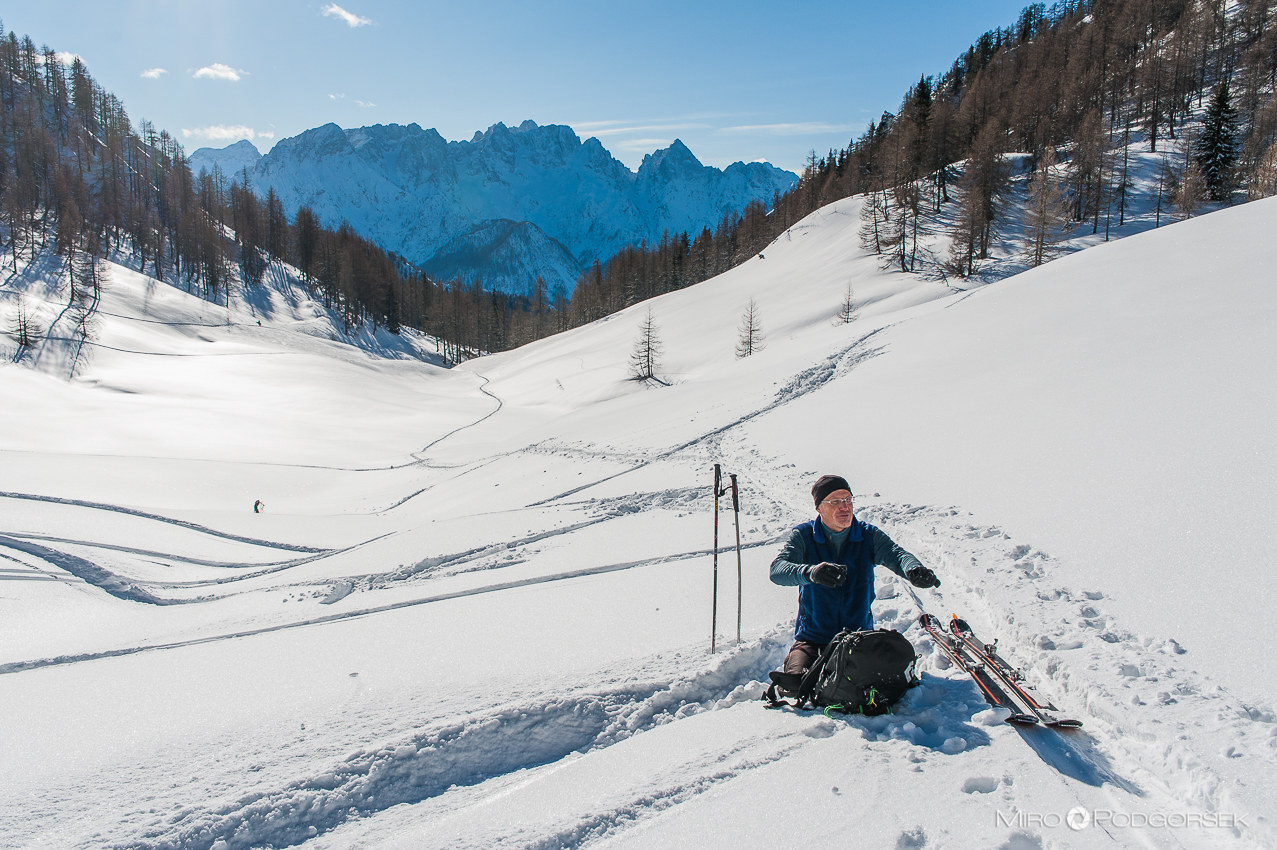 Spodaj še tretjič ekstra vprežemo cucke in se podamo do sedla pod Kresiščem od koder smučamo do strmega grabna, ki smo ga ogledovali že gor grede. V objemu sence in globokega minusa nas pričaka precej nedotaknjenega pršiča, ki ga z enakim navdušenjem kot prej, zvozimo.