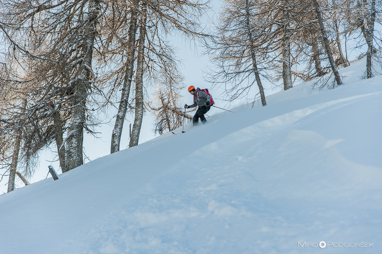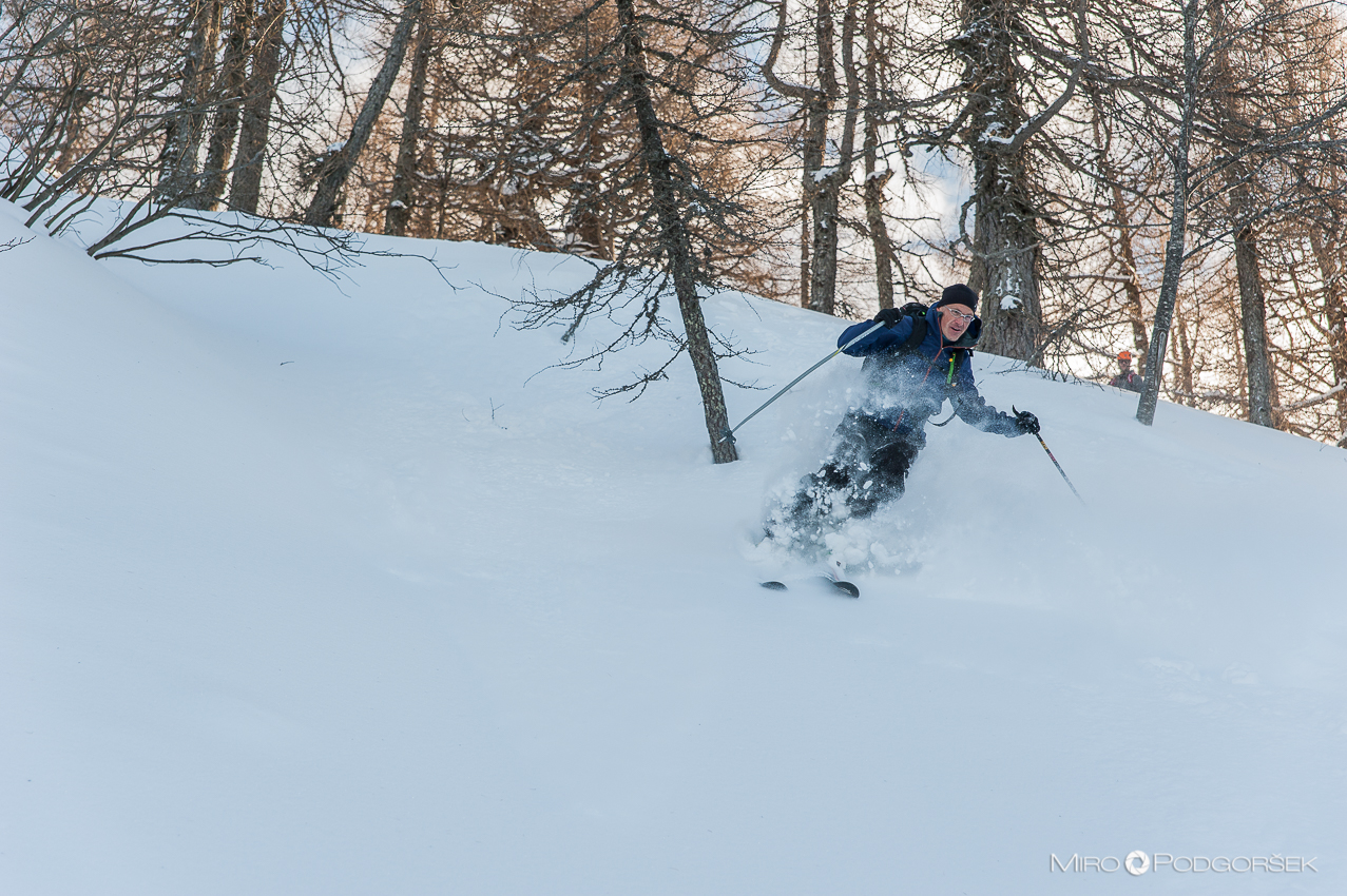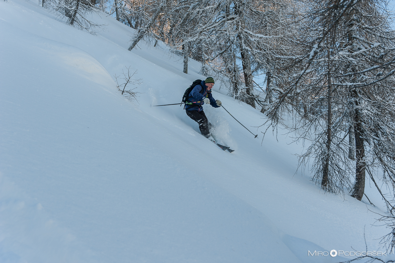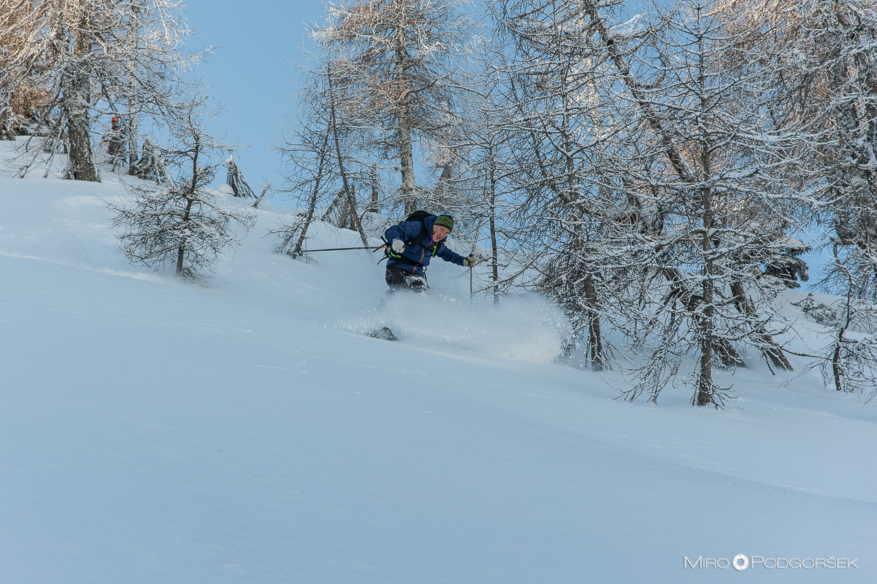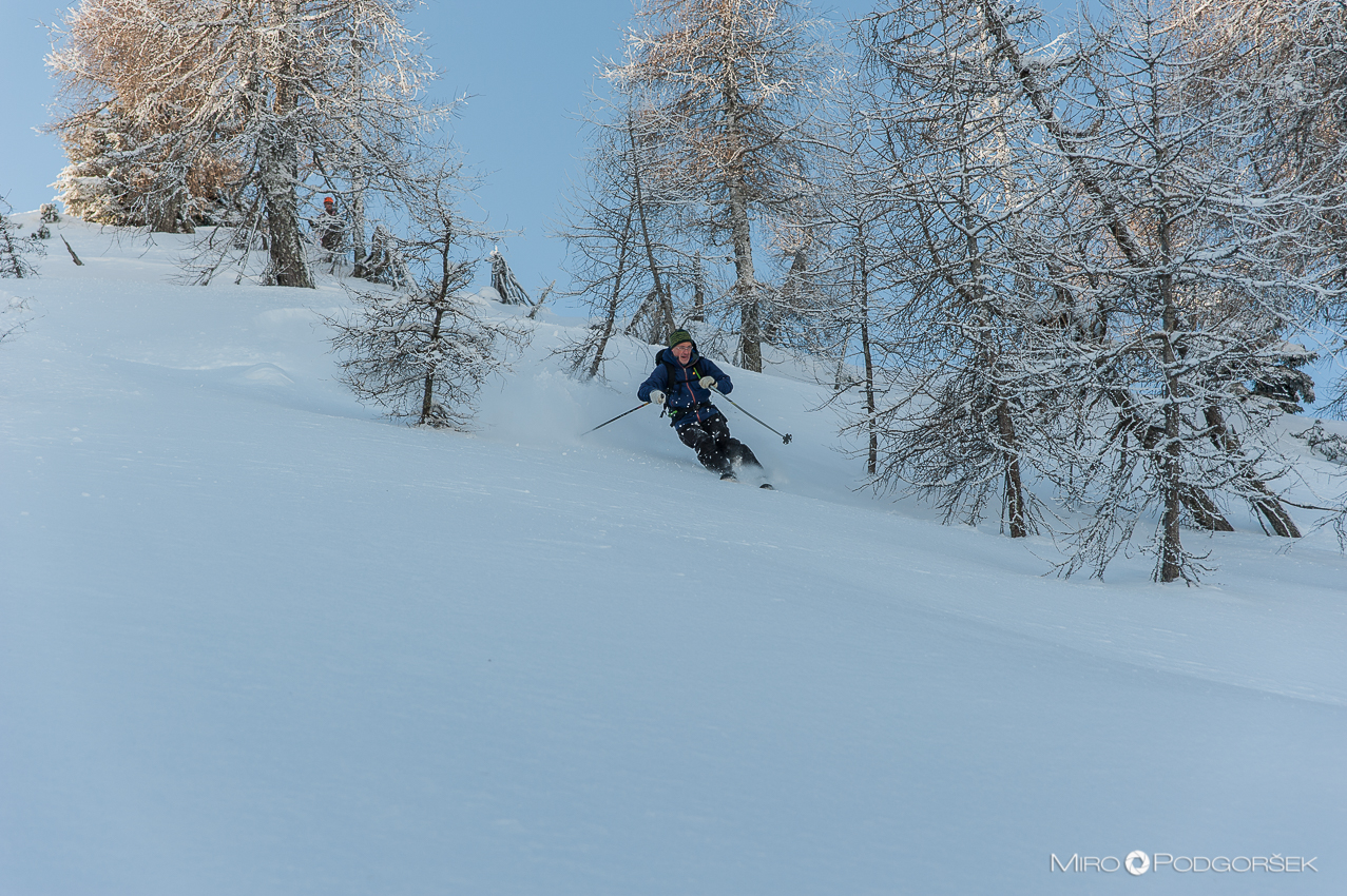 Nižje nad smučiščem v gozdu snežna odeja ne obeta prav brezskrbnega vijuganja, z višino pa tudi količina še nedotaknjenega pršiča narašča. Sončni žarki nas dosežejo na sedlu pod Kresiščem, od koder se spustimo nekaj višincev navzdol do planine, od tam pa se po severni strani povzpnemo na Murnovec. Z vrha poiščemo vsak svojo nedotaknjeno flanko med macesni in jo porišemo. Spodaj z nasmehi do ušes v sicer sibirskem mrazu urgentno pade odločitev, da vajo ponovimo v enakem slogu.