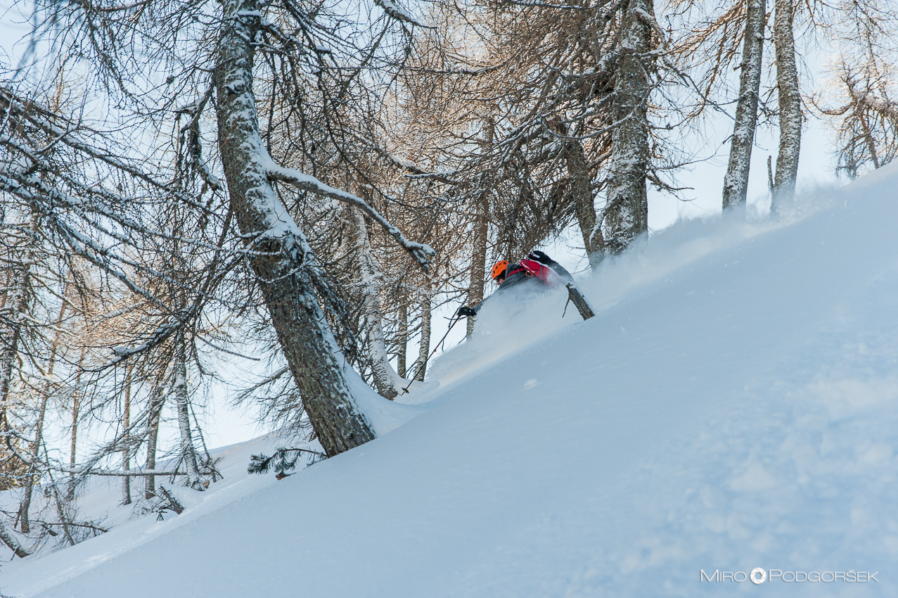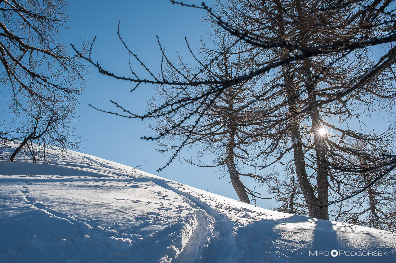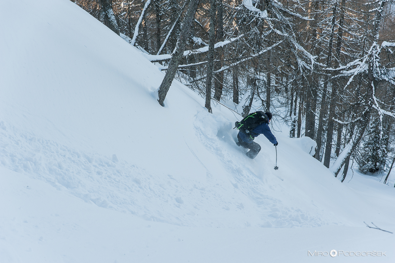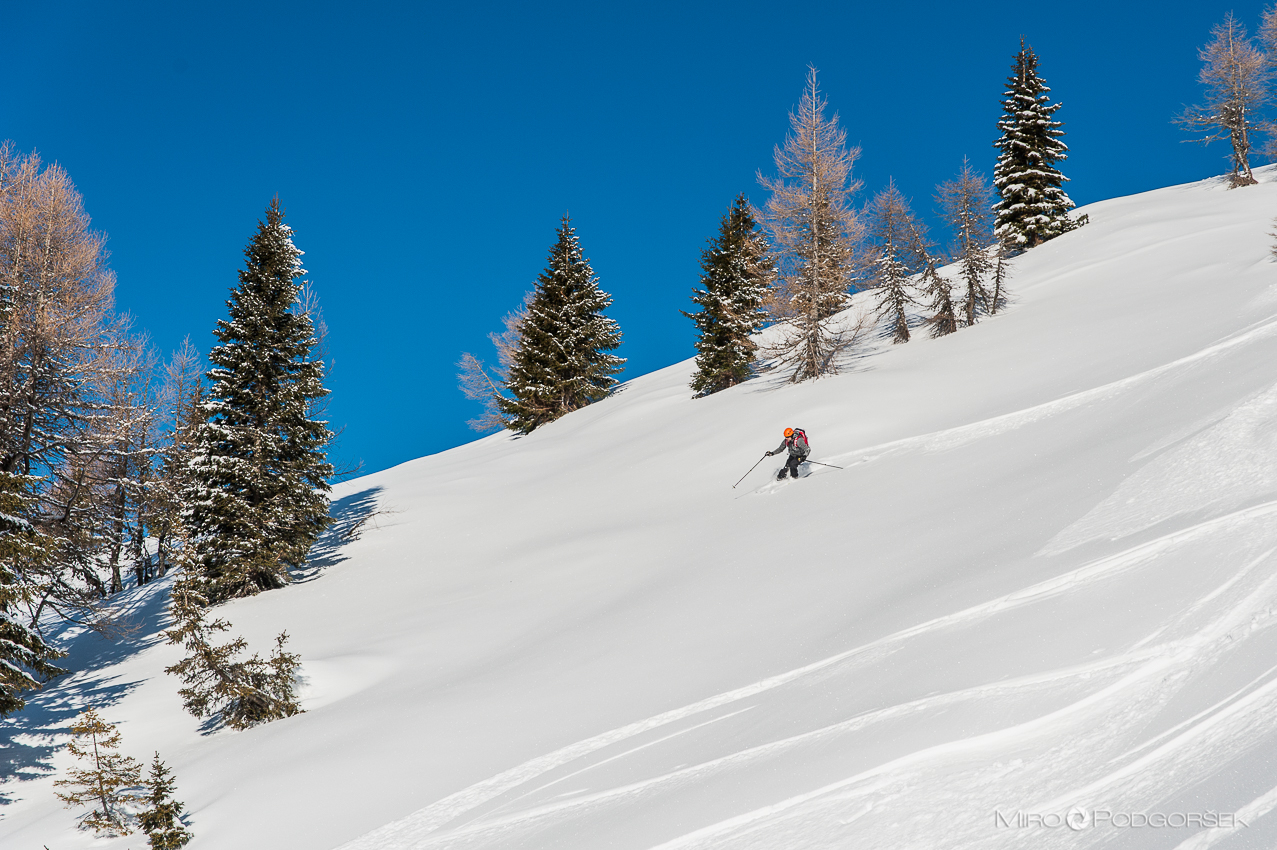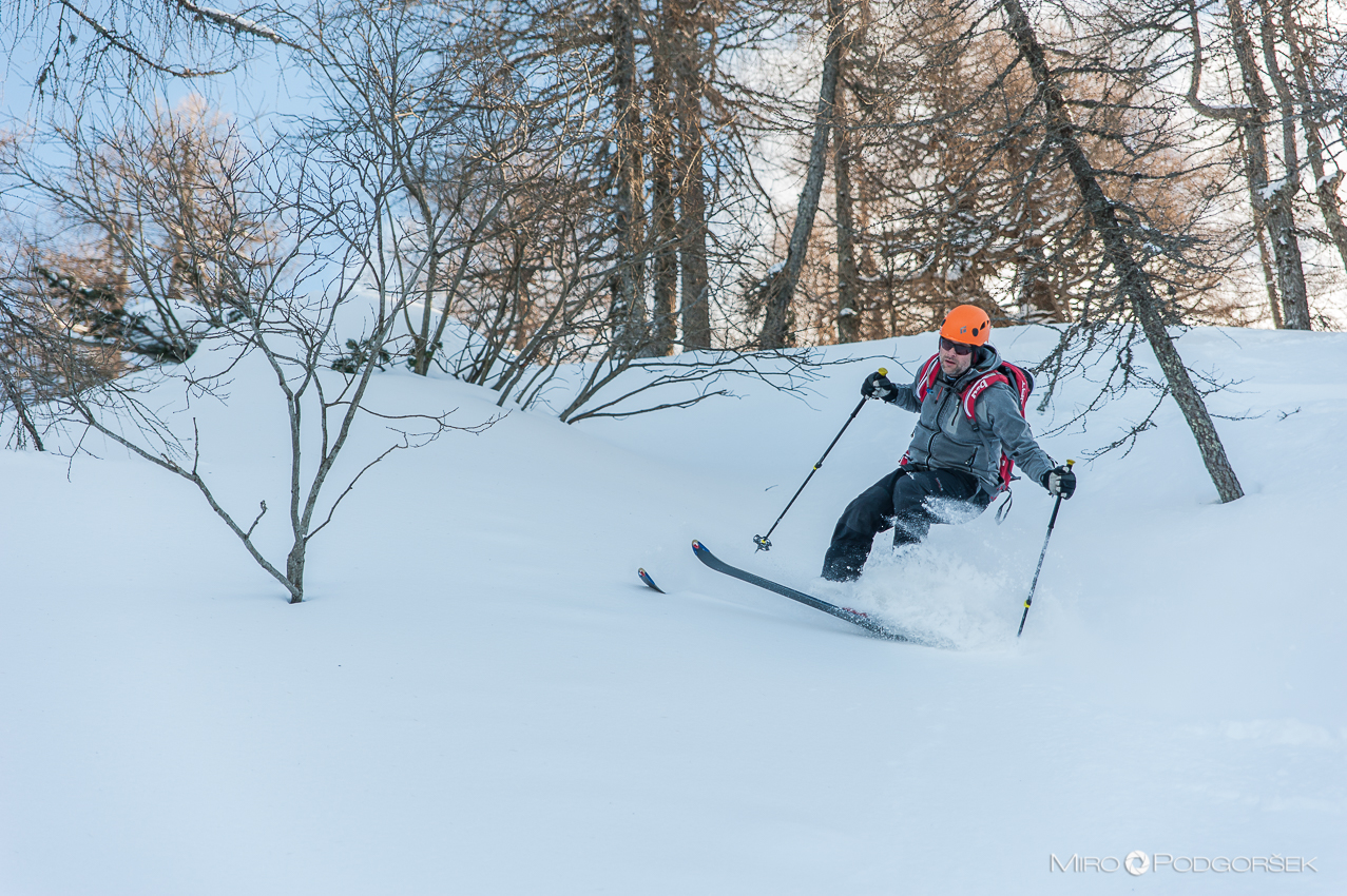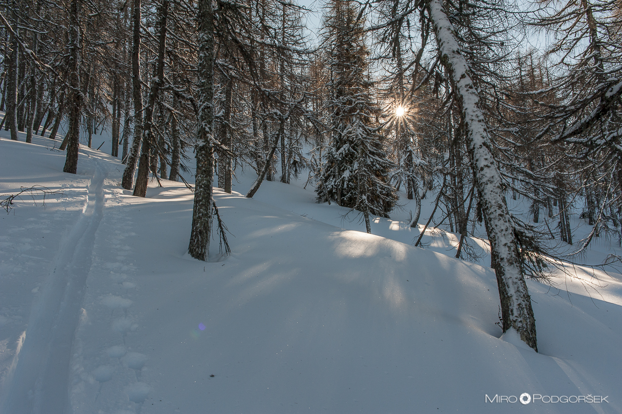 Nižje nad smučiščem v gozdu snežna odeja ne obeta prav brezskrbnega vijuganja, z višino pa tudi količina še nedotaknjenega pršiča narašča. Sončni žarki nas dosežejo na sedlu pod Kresiščem, od koder se spustimo nekaj višincev navzdol do planine, od tam pa se po severni strani povzpnemo na Murnovec. Z vrha poiščemo vsak svojo nedotaknjeno flanko med macesni in jo porišemo. Spodaj z nasmehi do ušes v sicer sibirskem mrazu urgentno pade odločitev, da vajo ponovimo v enakem slogu.