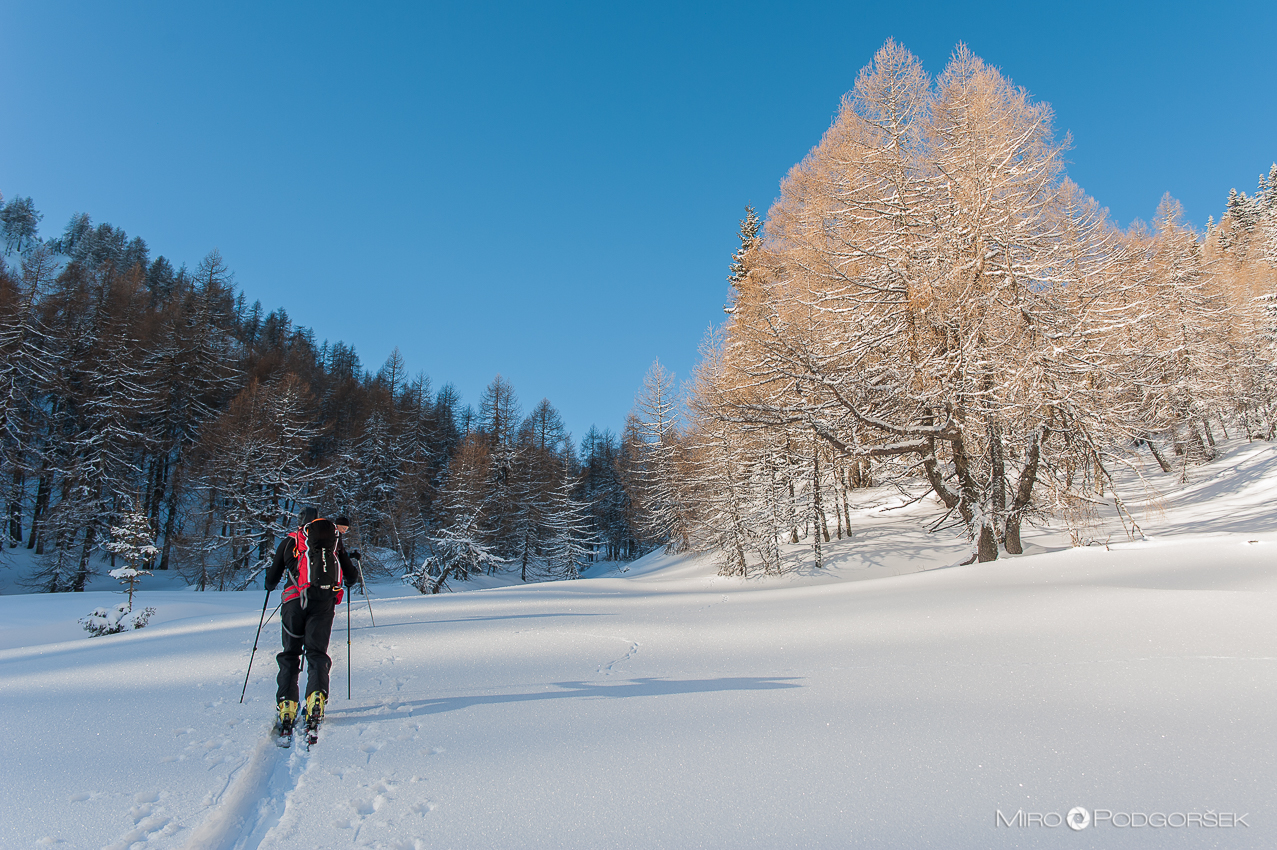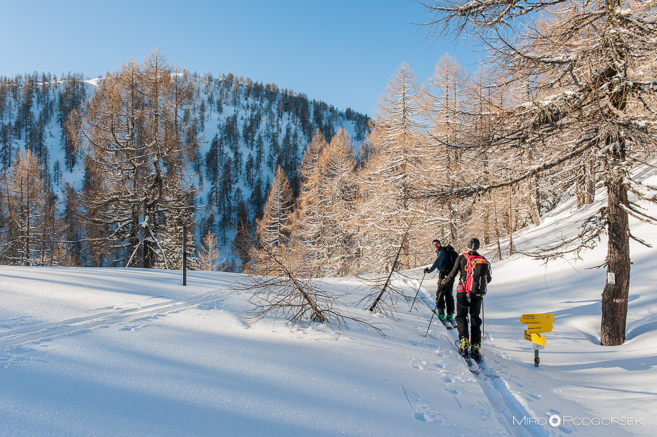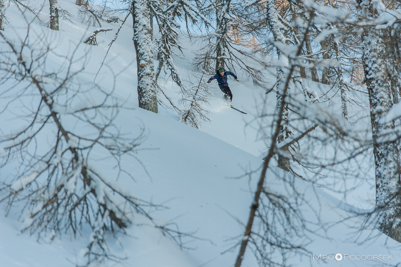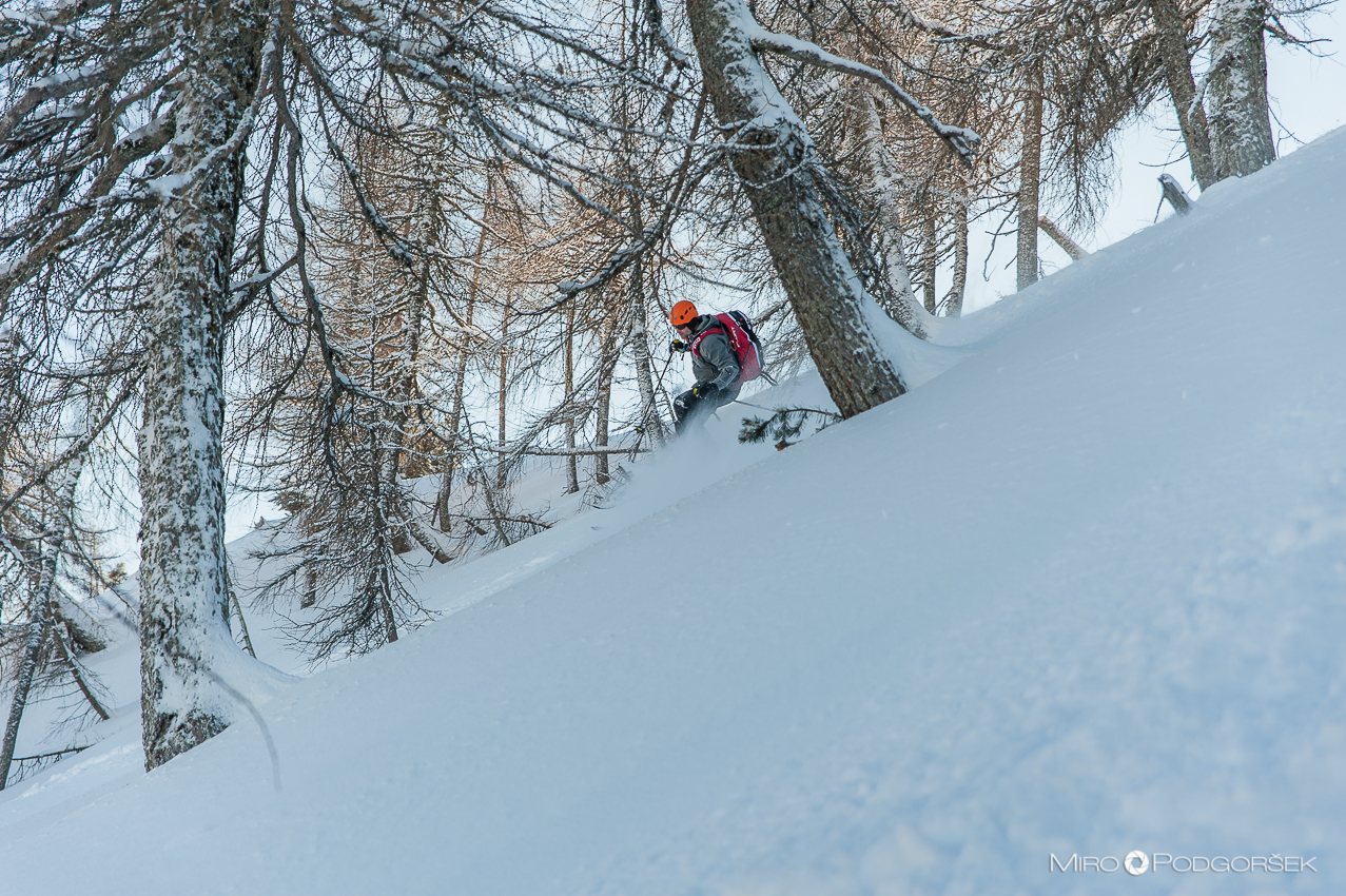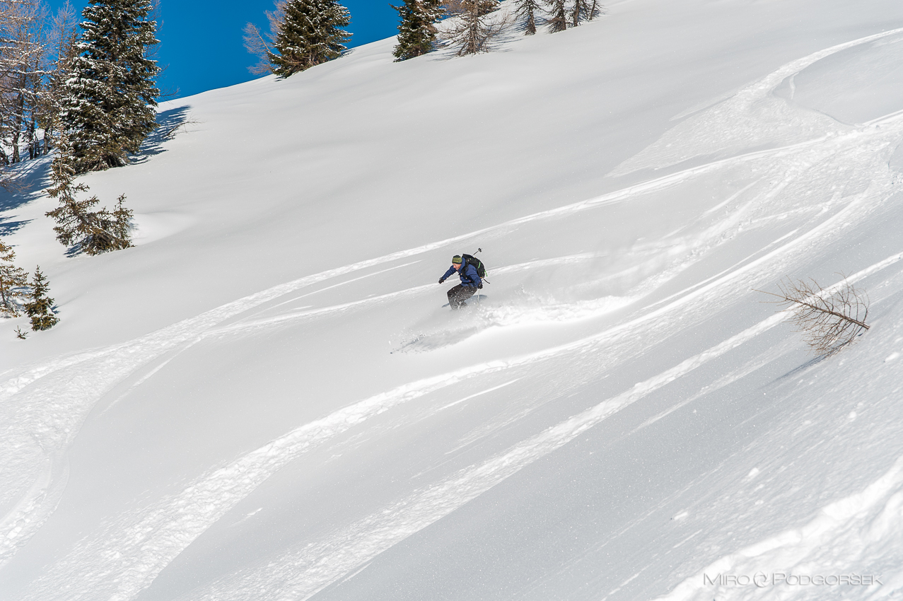 Nižje nad smučiščem v gozdu snežna odeja ne obeta prav brezskrbnega vijuganja, z višino pa tudi količina še nedotaknjenega pršiča narašča. Sončni žarki nas dosežejo na sedlu pod Kresiščem, od koder se spustimo nekaj višincev navzdol do planine, od tam pa se po severni strani povzpnemo na Murnovec. Z vrha poiščemo vsak svojo nedotaknjeno flanko med macesni in jo porišemo. Spodaj z nasmehi do ušes v sicer sibirskem mrazu urgentno pade odločitev, da vajo ponovimo v enakem slogu.