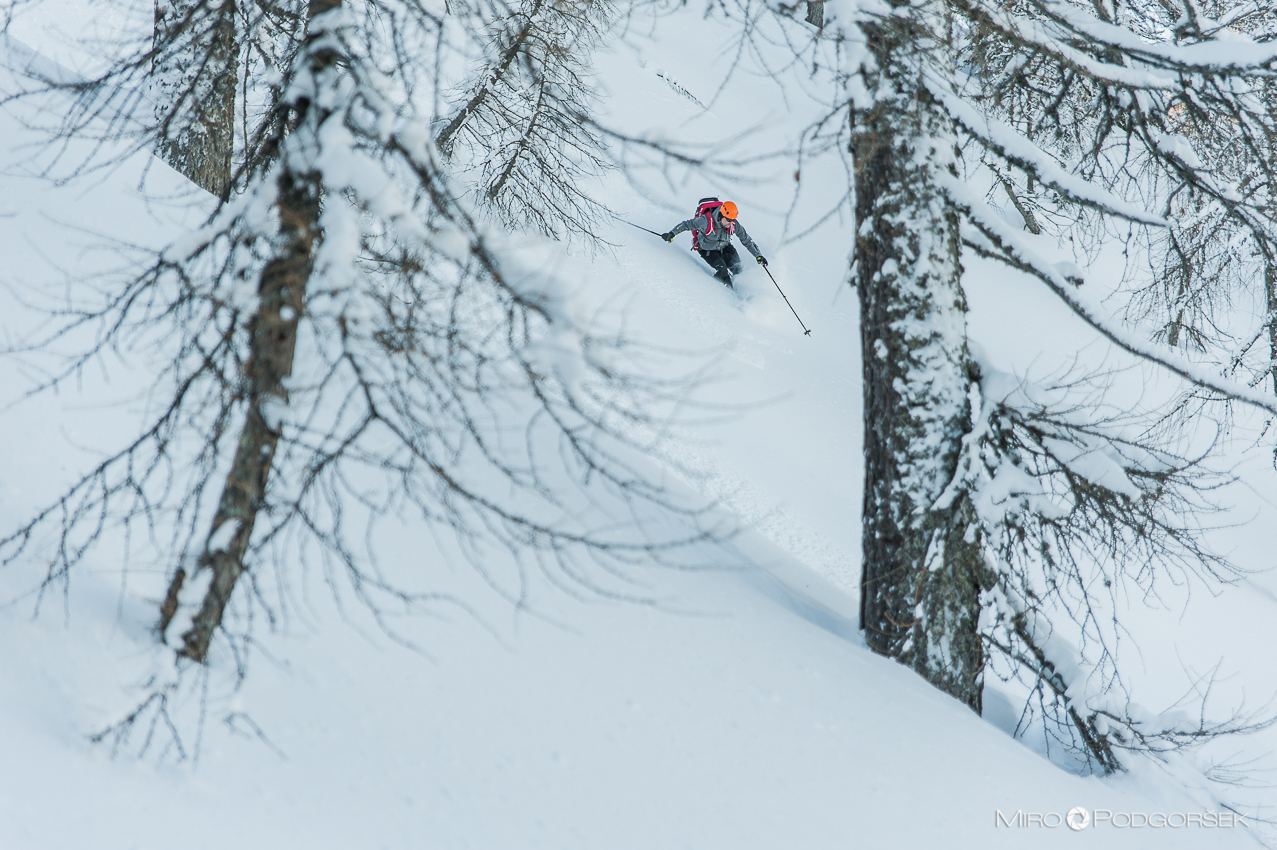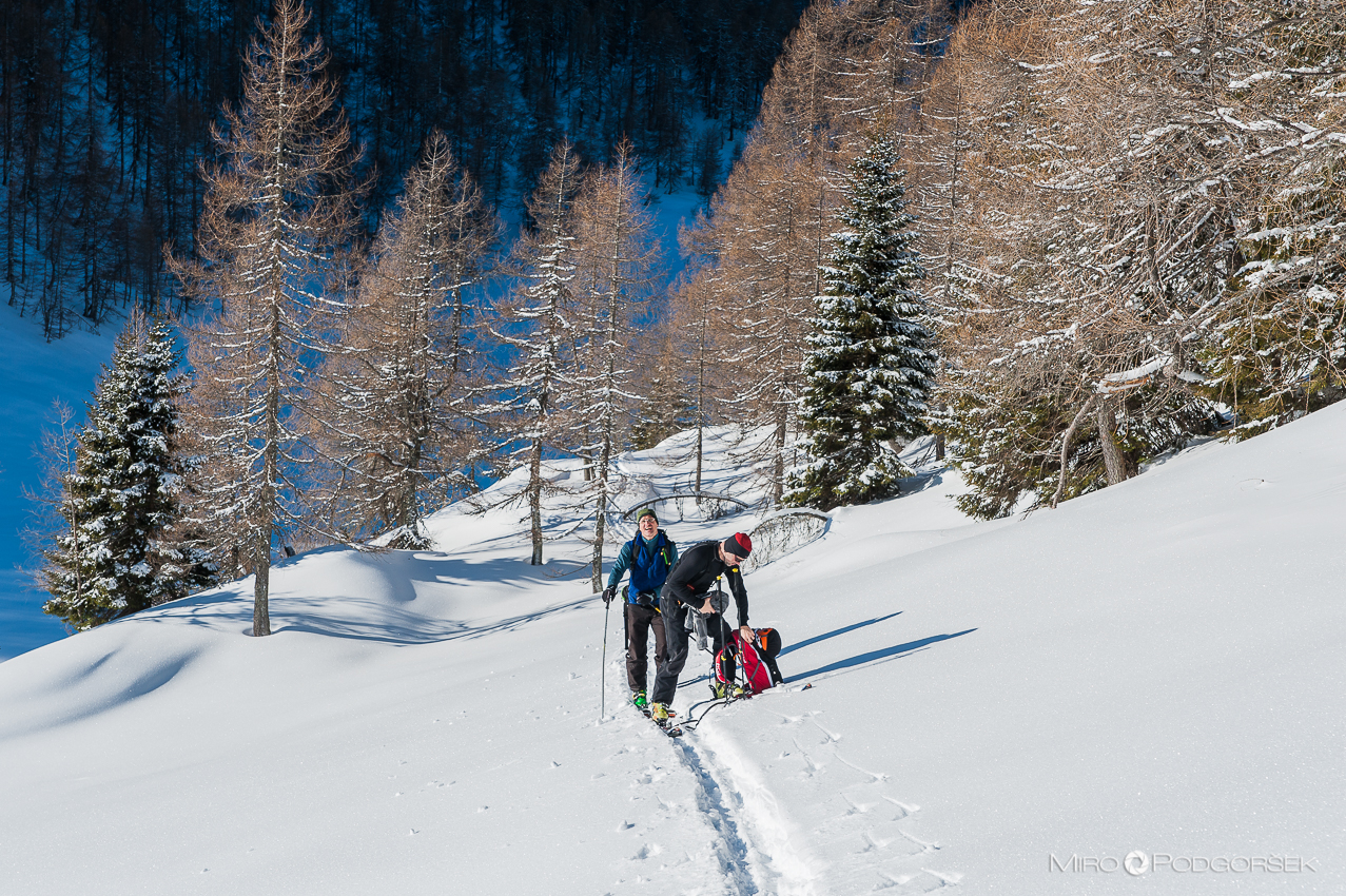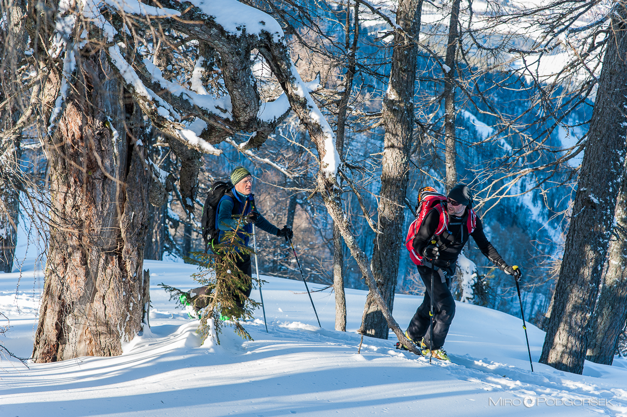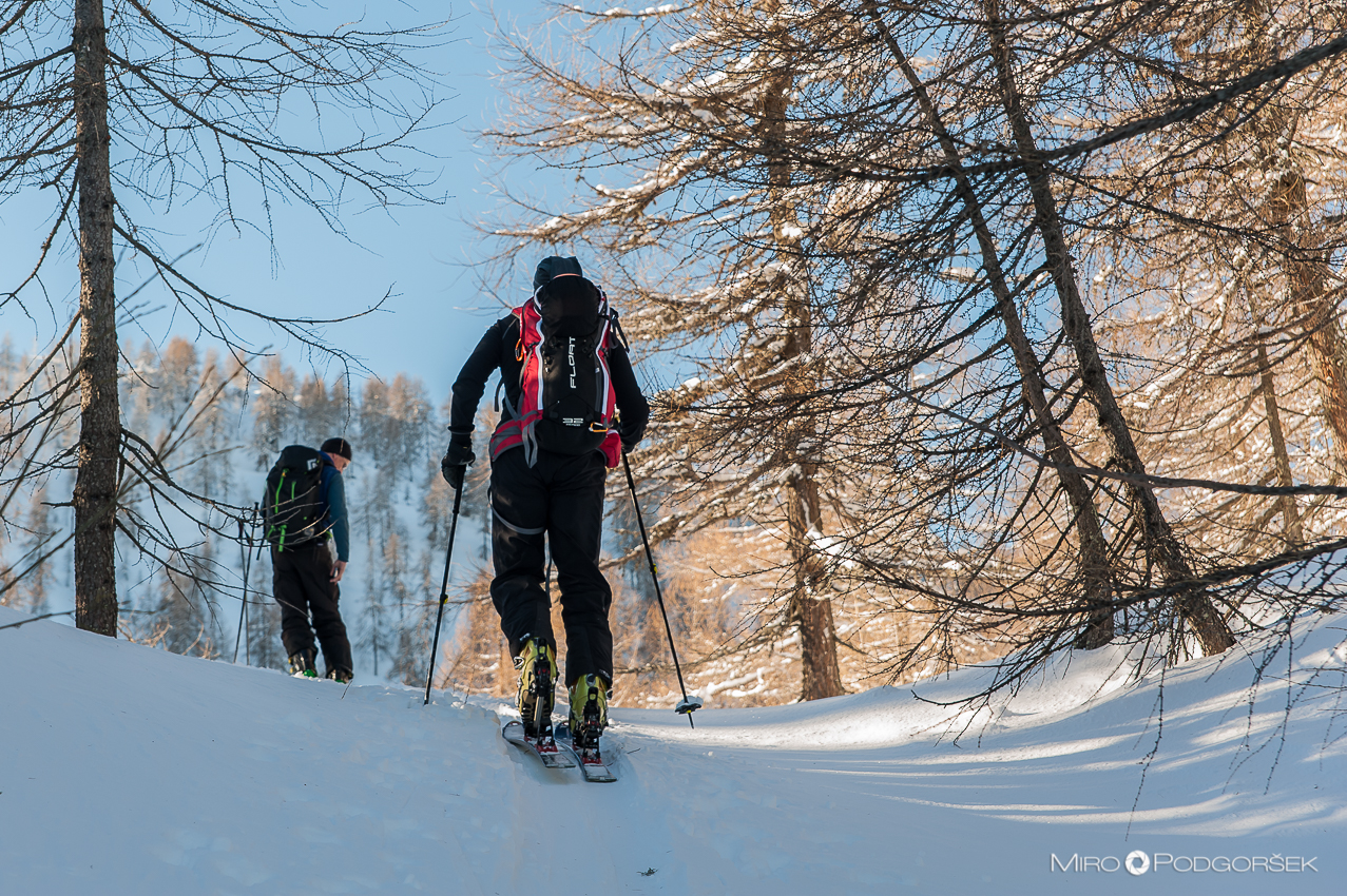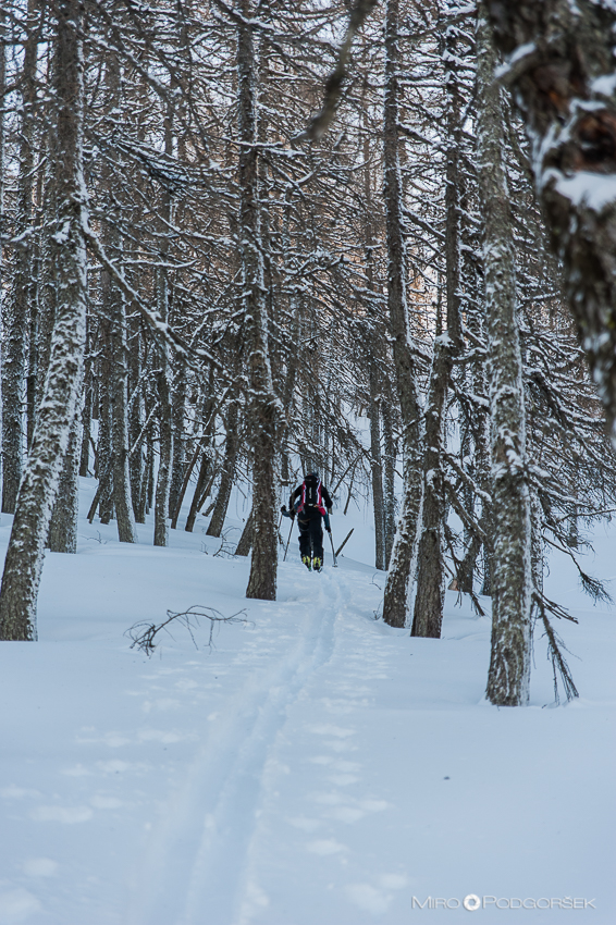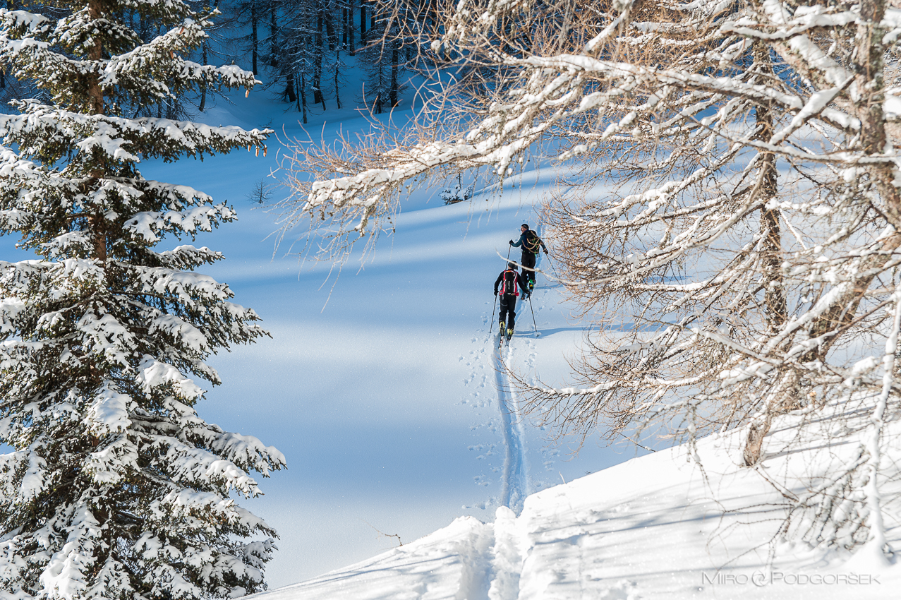 Nižje nad smučiščem v gozdu snežna odeja ne obeta prav brezskrbnega vijuganja, z višino pa tudi količina še nedotaknjenega pršiča narašča. Sončni žarki nas dosežejo na sedlu pod Kresiščem, od koder se spustimo nekaj višincev navzdol do planine, od tam pa se po severni strani povzpnemo na Murnovec. Z vrha poiščemo vsak svojo nedotaknjeno flanko med macesni in jo porišemo. Spodaj z nasmehi do ušes v sicer sibirskem mrazu urgentno pade odločitev, da vajo ponovimo v enakem slogu.