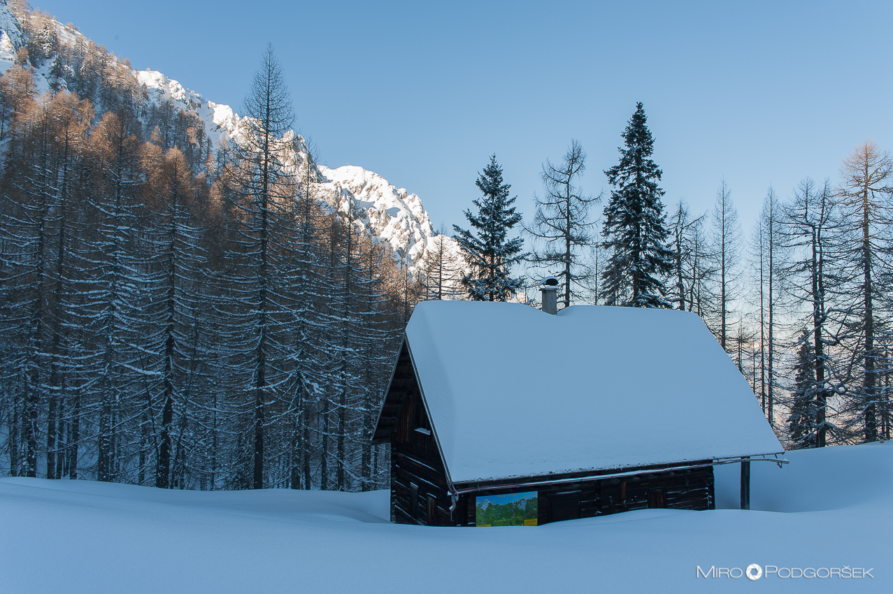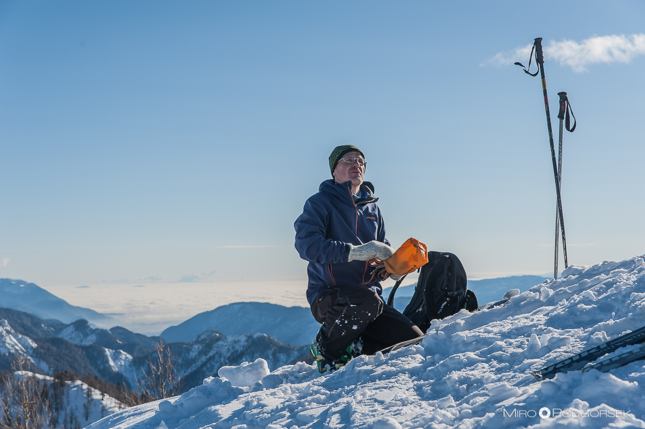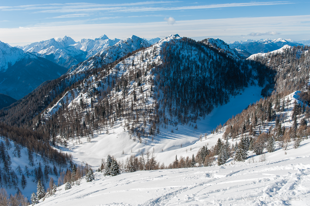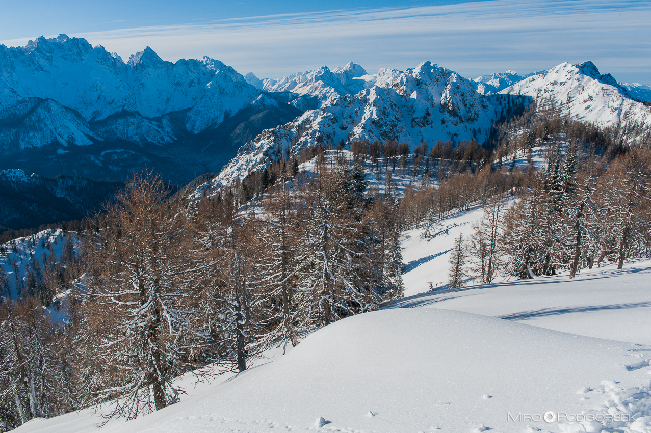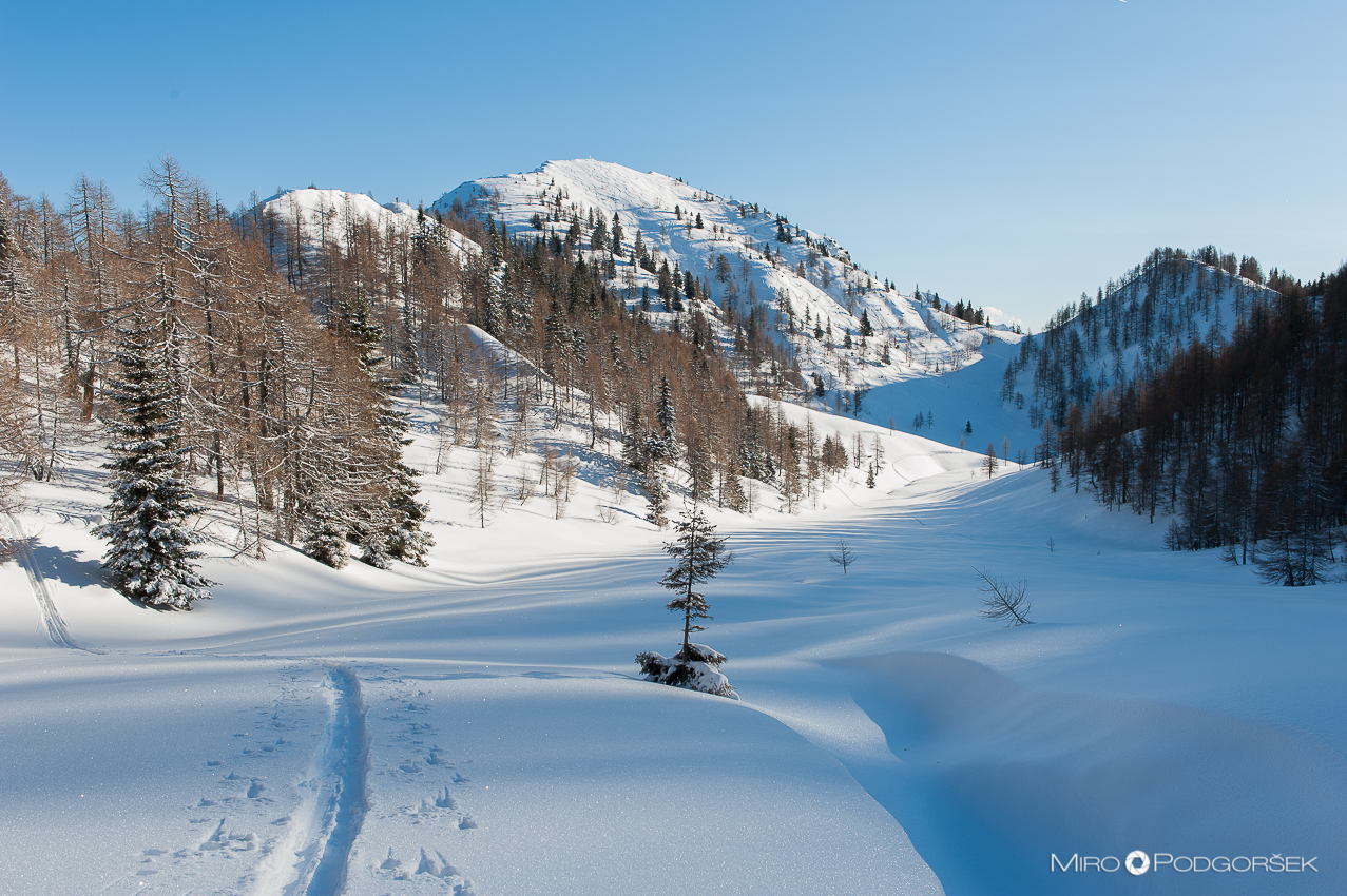 Nižje nad smučiščem v gozdu snežna odeja ne obeta prav brezskrbnega vijuganja, z višino pa tudi količina še nedotaknjenega pršiča narašča. Sončni žarki nas dosežejo na sedlu pod Kresiščem, od koder se spustimo nekaj višincev navzdol do planine, od tam pa se po severni strani povzpnemo na Murnovec. Z vrha poiščemo vsak svojo nedotaknjeno flanko med macesni in jo porišemo. Spodaj z nasmehi do ušes v sicer sibirskem mrazu urgentno pade odločitev, da vajo ponovimo v enakem slogu.
