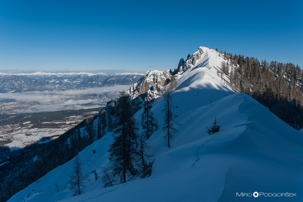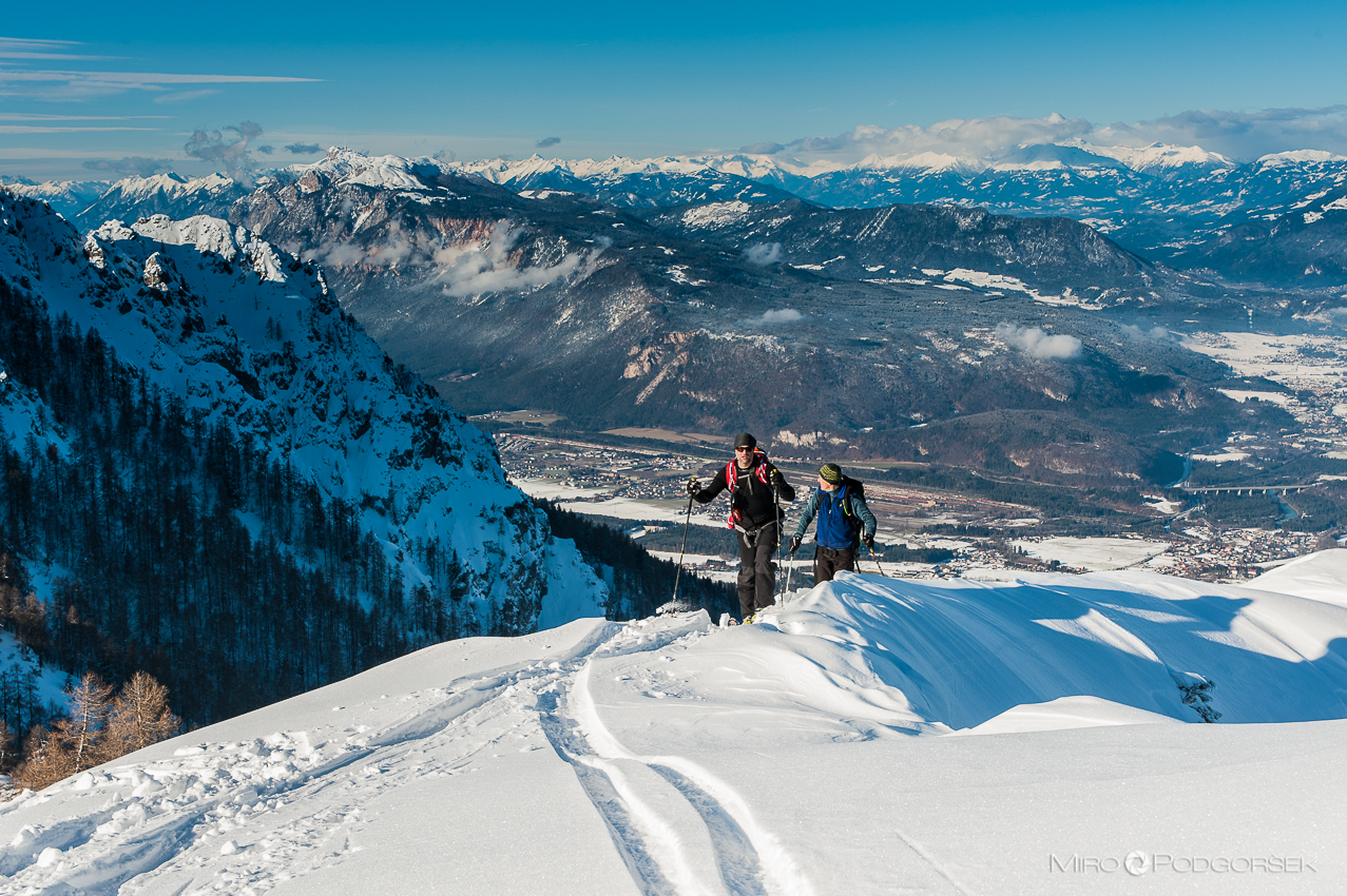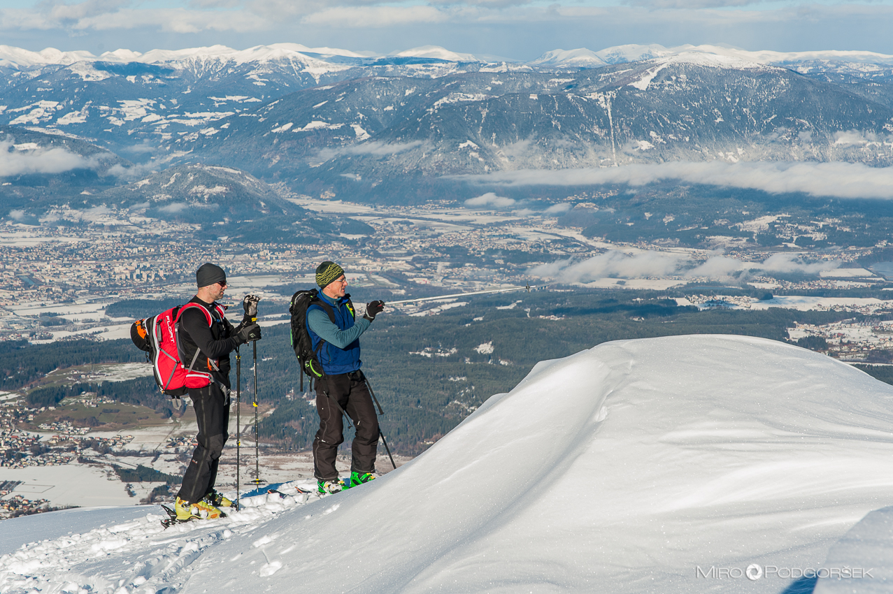 Ekipa v zasedbi Uroš, Žiga in jaz zapeljemo na ono stran Karavank vse tja do Baumgartnerhofa v Ločah (Latschach), kjer vprežemo cucke in se podamo v mrzlo jutro. Pot nas pelje čez opuščeno smučišče, nato pa skozi gozd vse do Mitzl Moitzl koče, od koder se nam počasi začnejo odpirati razgledi na Karavanke s severa.
