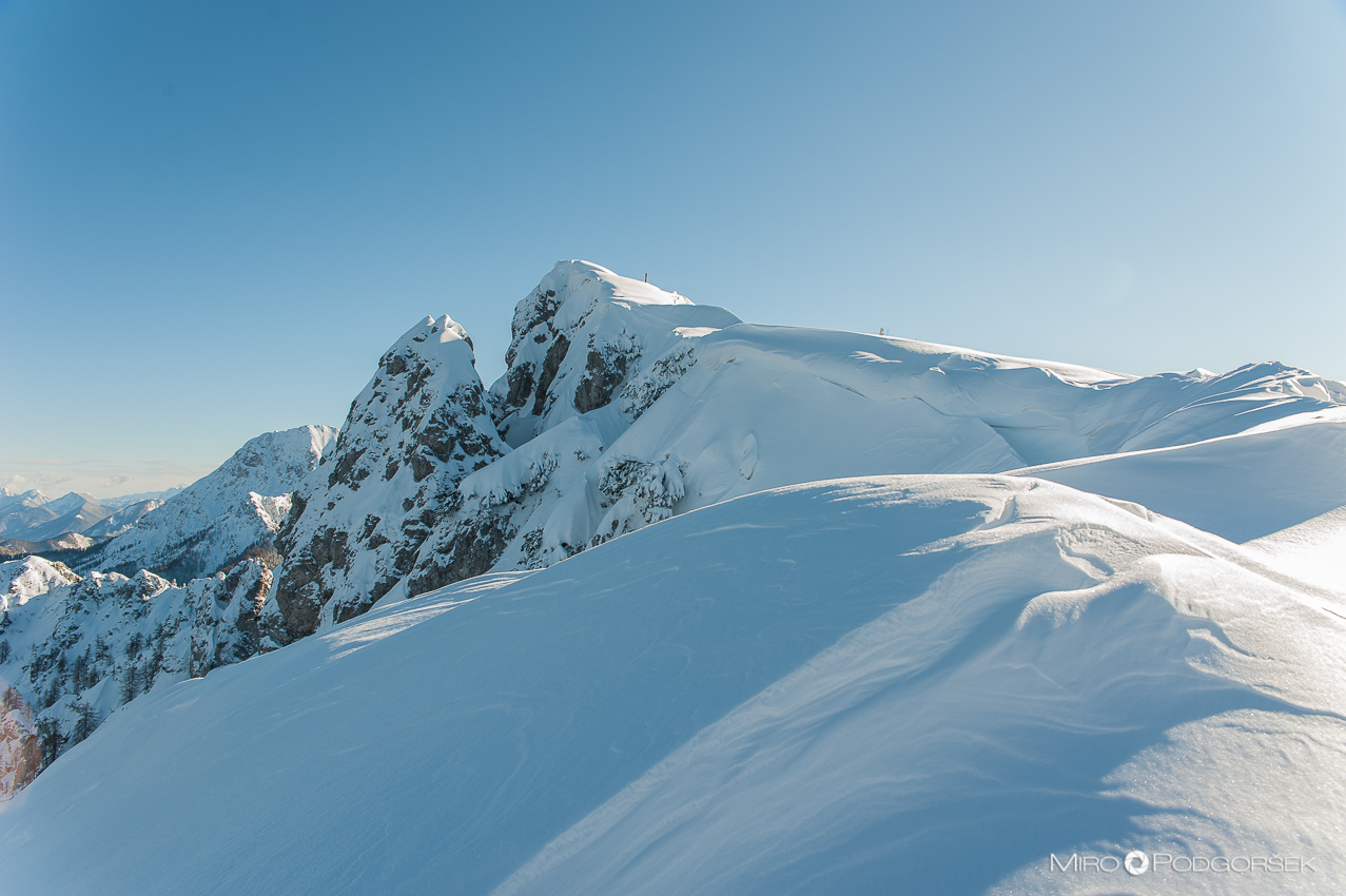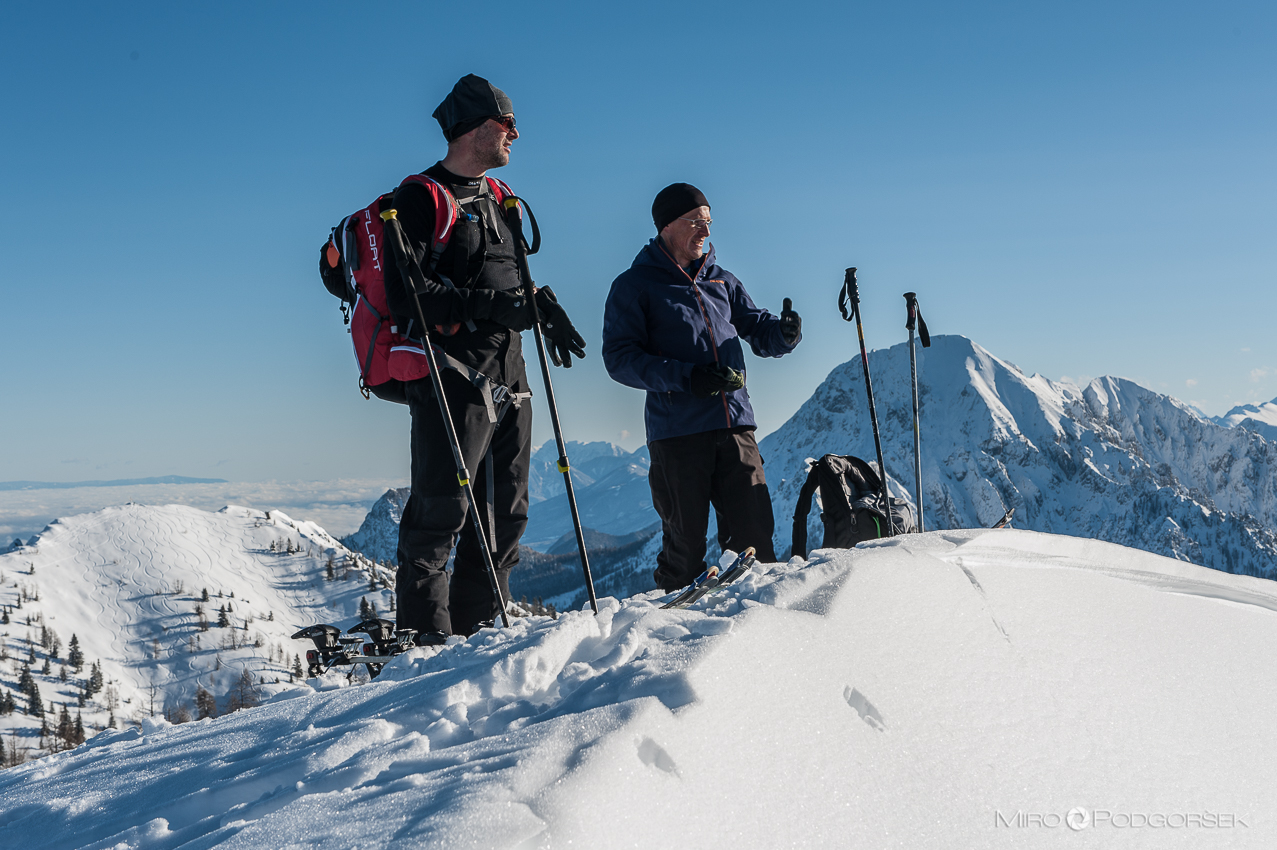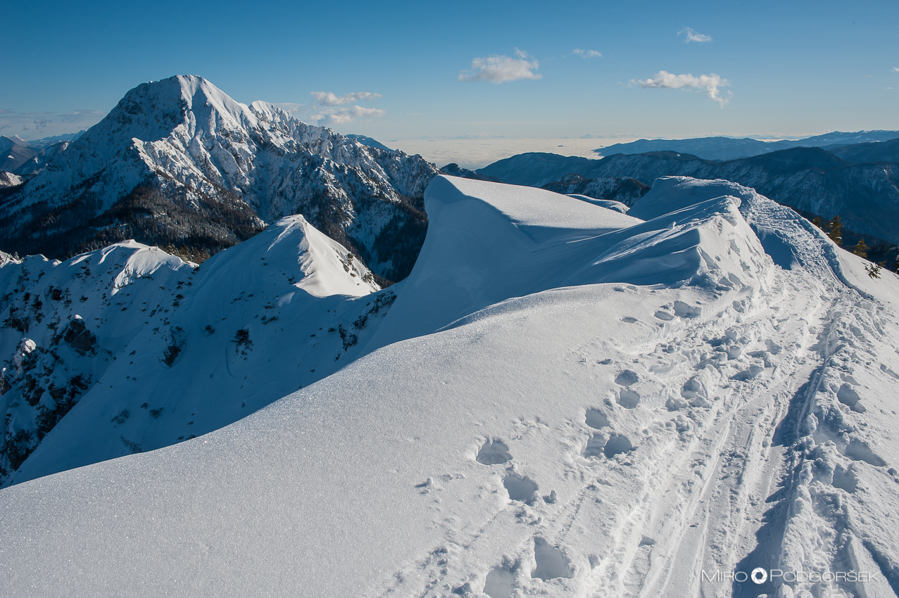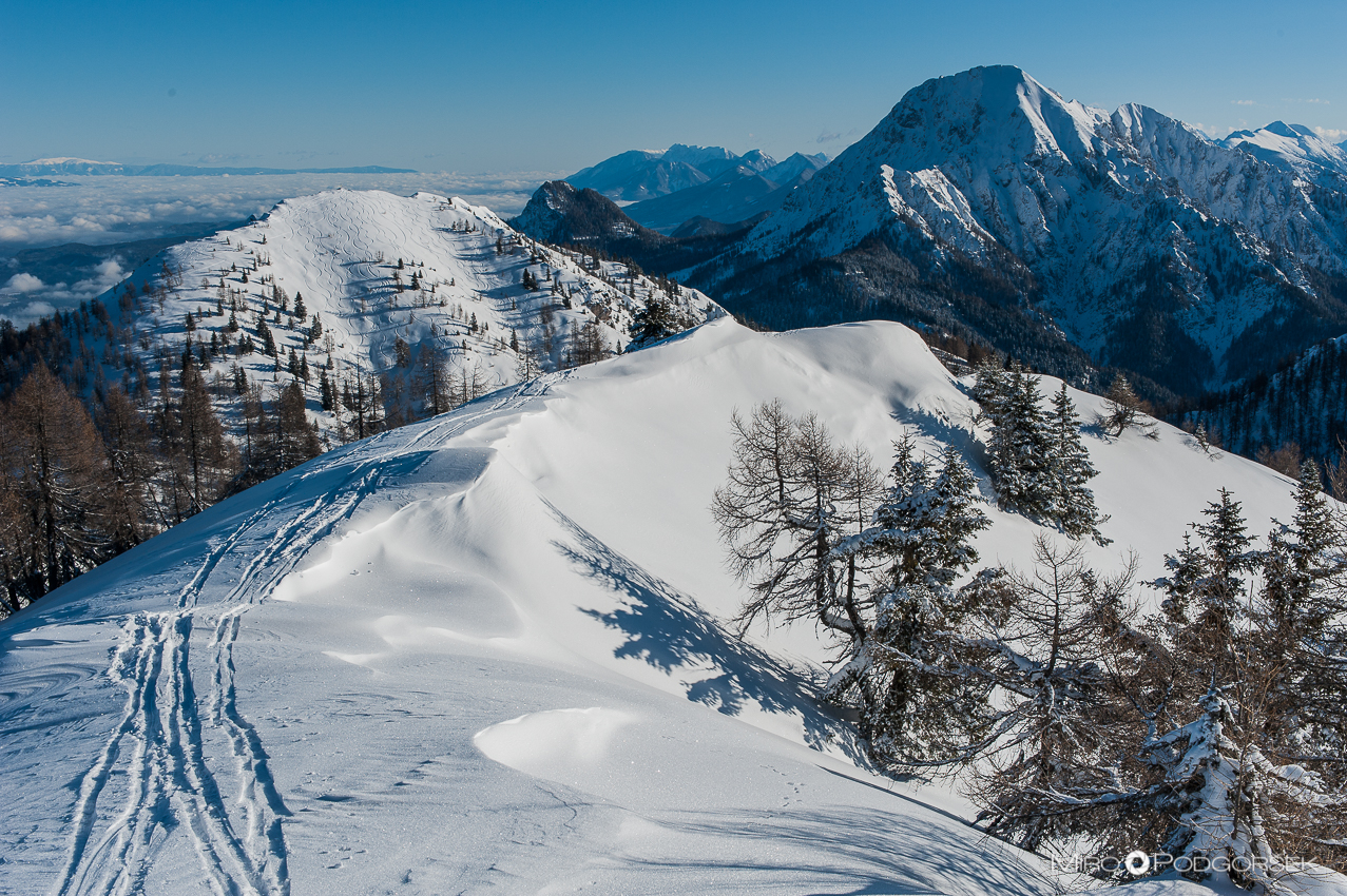 Kresišče od daleč zgleda precej zvoženo, a ko dosežemo vrh družno ugotovimo, da bi si lahko privoščili še vsak svojo nezvoženo sončno linijo. Vriskajoč zapustimo vrh, saj se kljub temu, da so flanke obrnjene proti soncu, izpod smučk še vedno veselo praši.