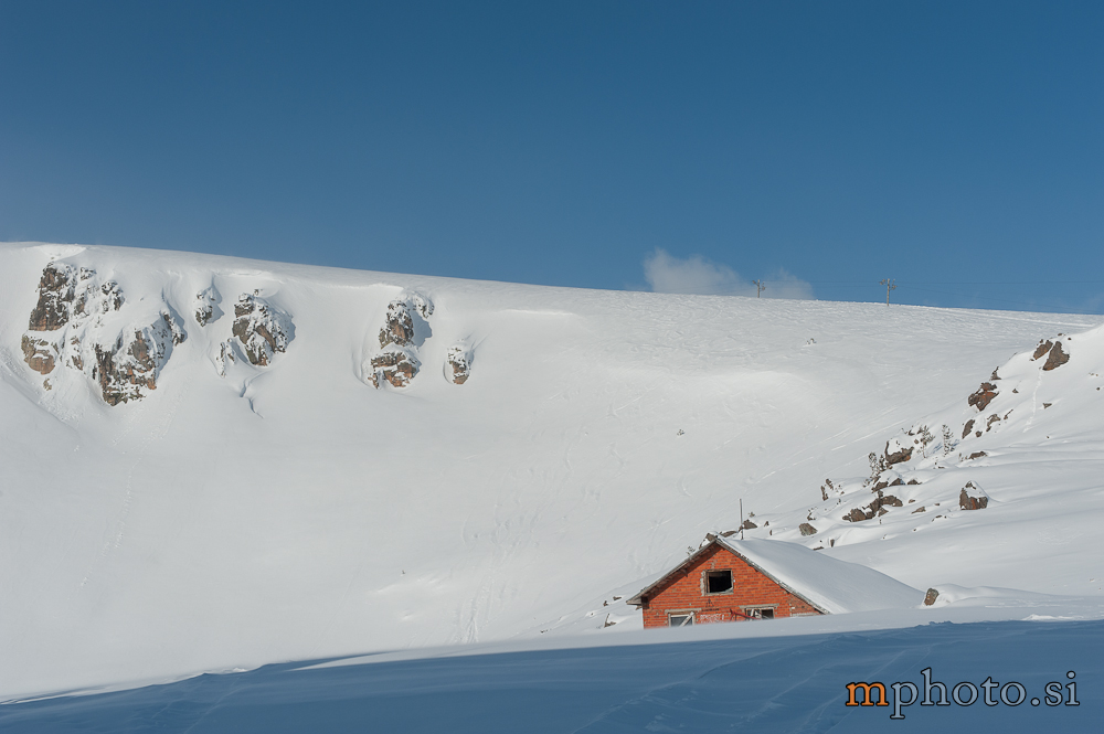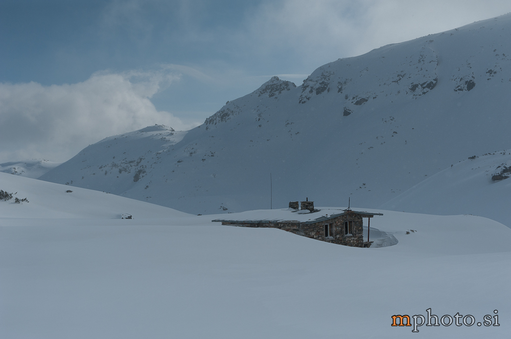 Tokrat šele natančneje vidimo kako debela je snežna odeja. Če brunarica nebi imela dimnika je niti oskrbnik verjetno nebi našel.