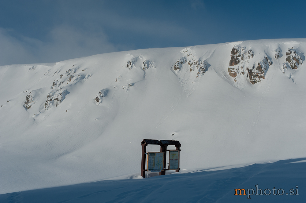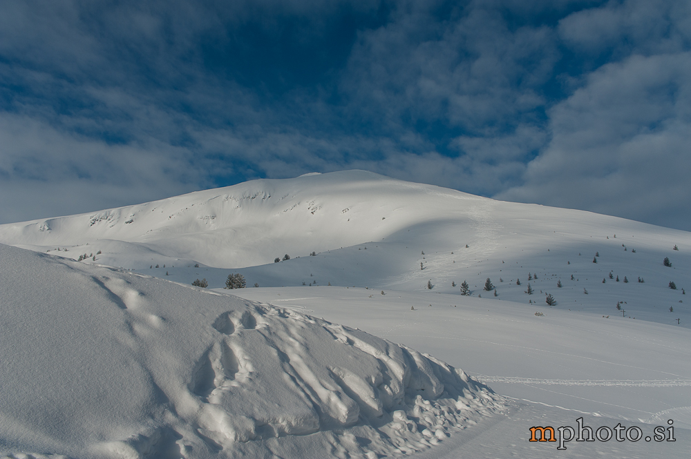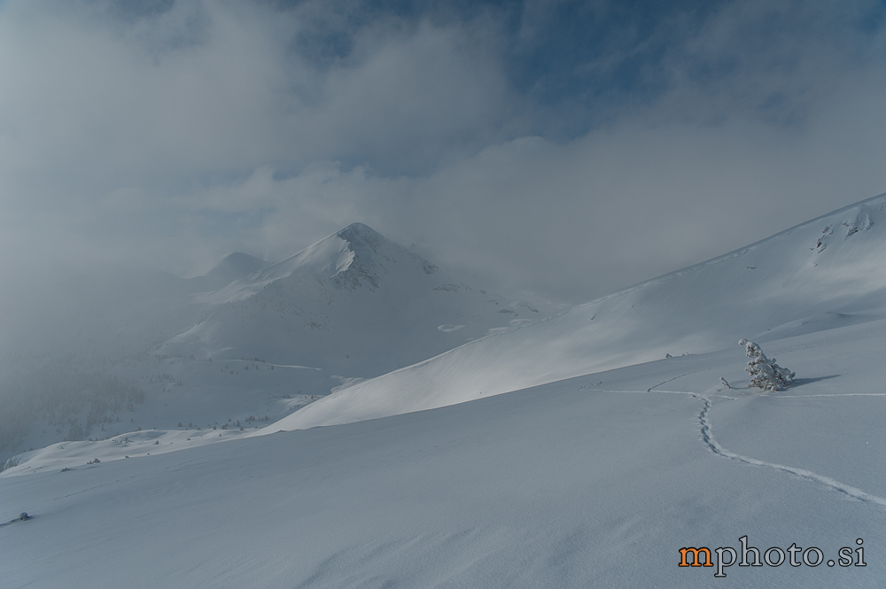Po prostranih planjavah uživamo v razgledih v tistih redkih momentih jasnine. Poti so tu označene tudi z zimskimi markaciji, a mi uberemo vsak svojo pot…tisto najboljšo 😉