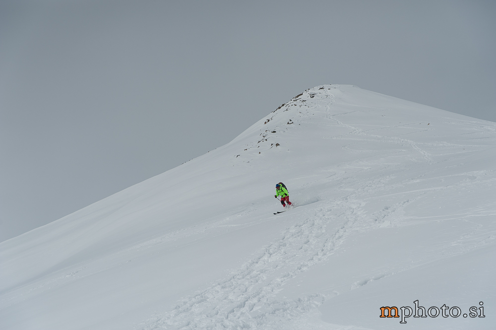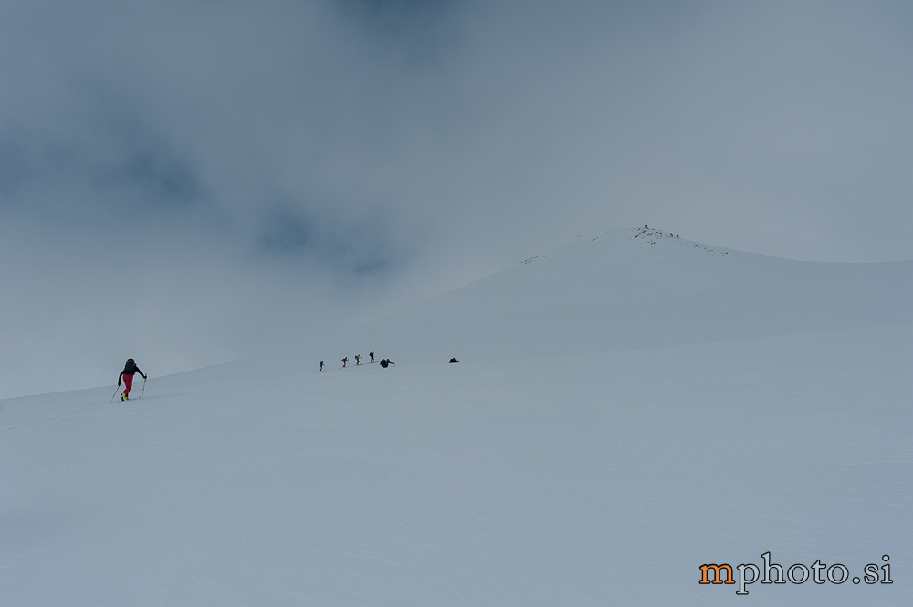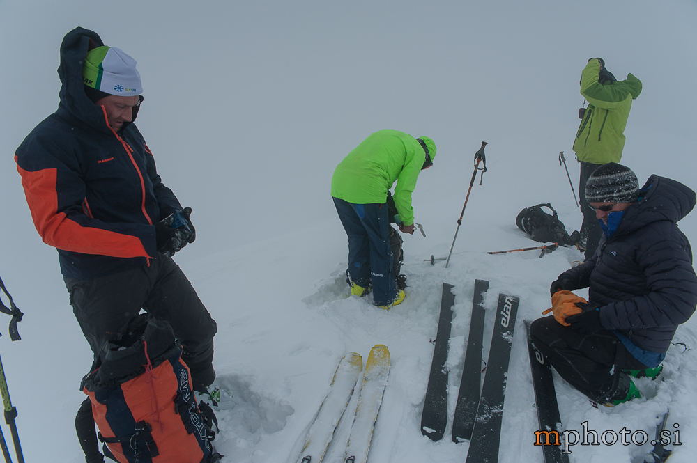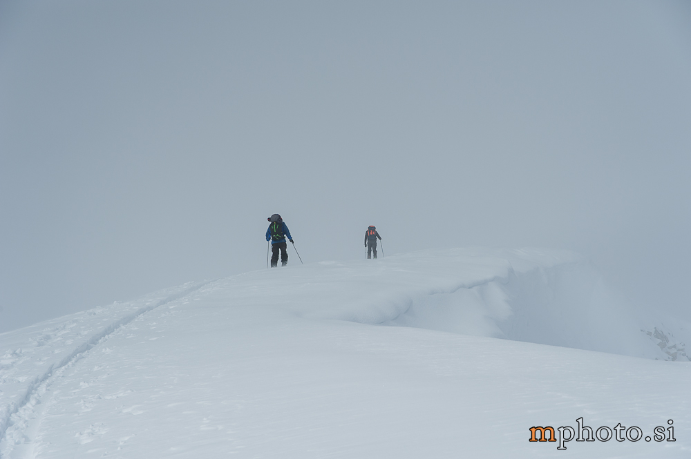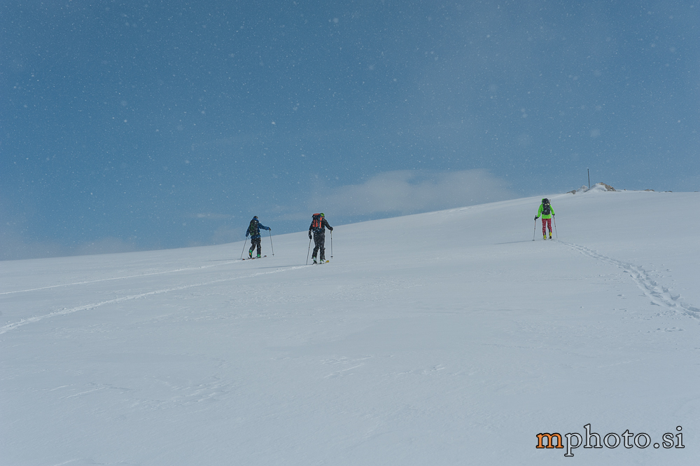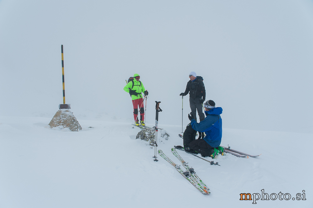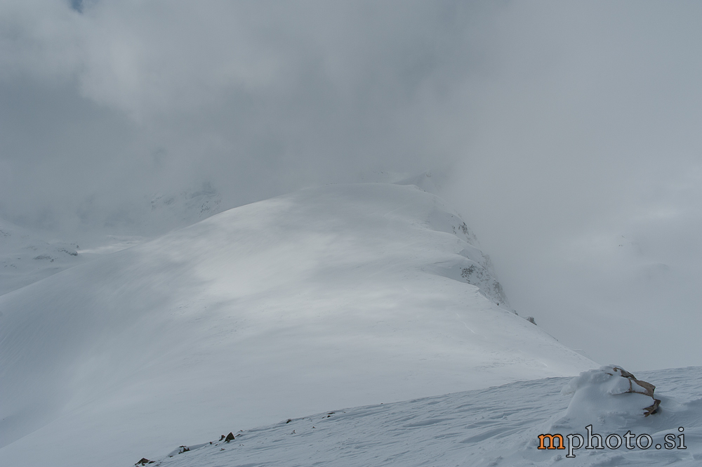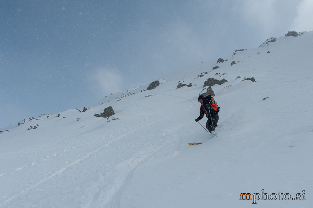 Še zadnje trenutke vidljivosti izkoristimo za spust z vrha. Od spodnjega dela proti koči pa se držimo špure kot pijanec plota, da sploh najdemo kočo.