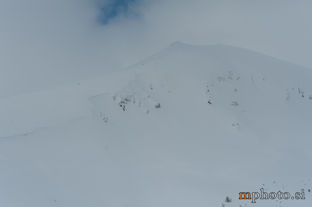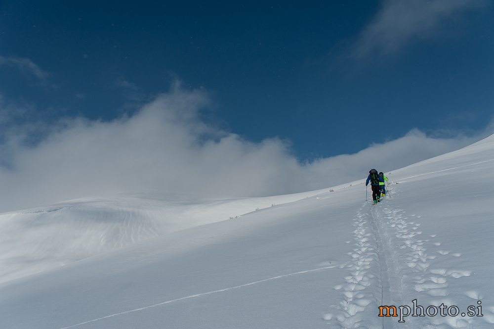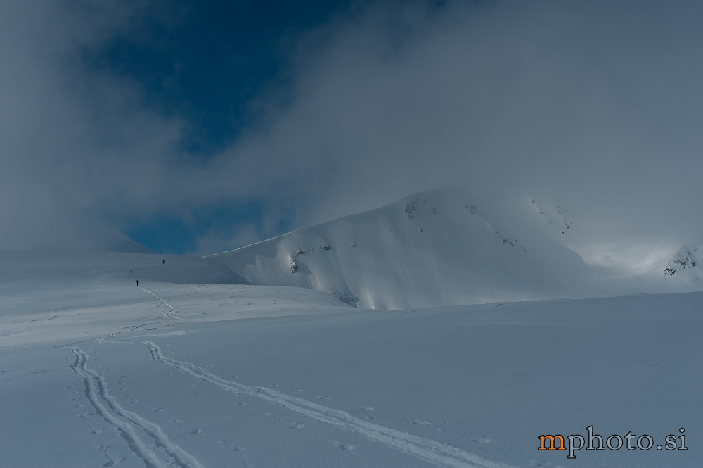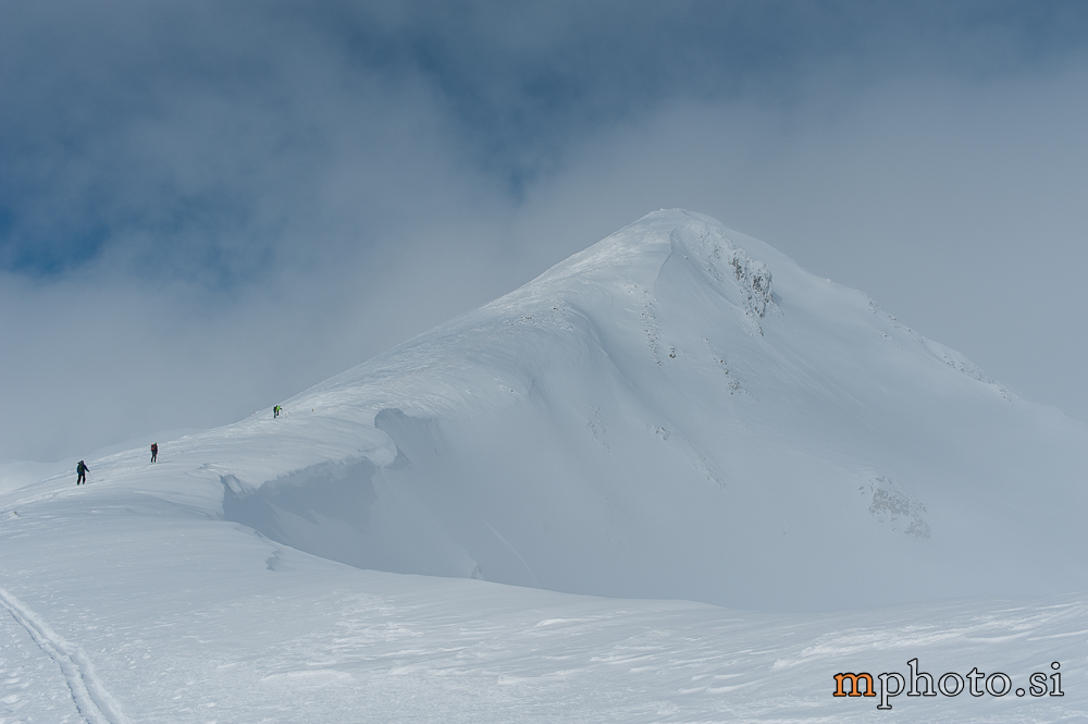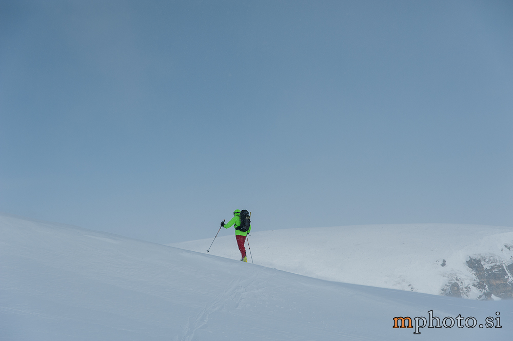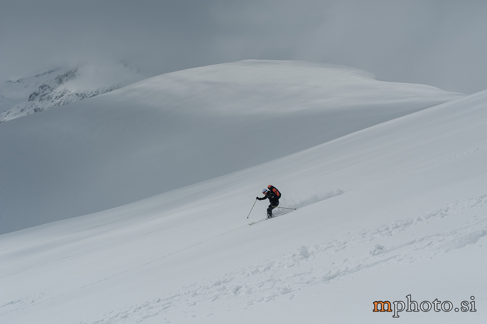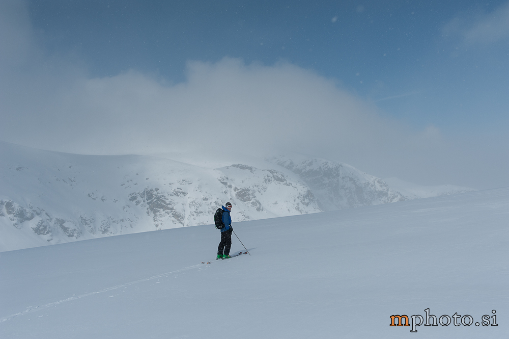Še zadnje trenutke vidljivosti izkoristimo za spust z vrha. Od spodnjega dela proti koči pa se držimo špure kot pijanec plota, da sploh najdemo kočo.