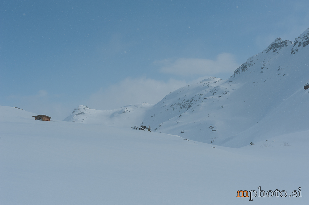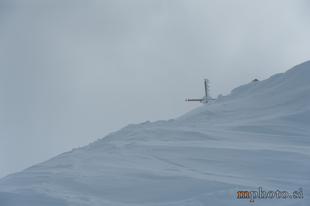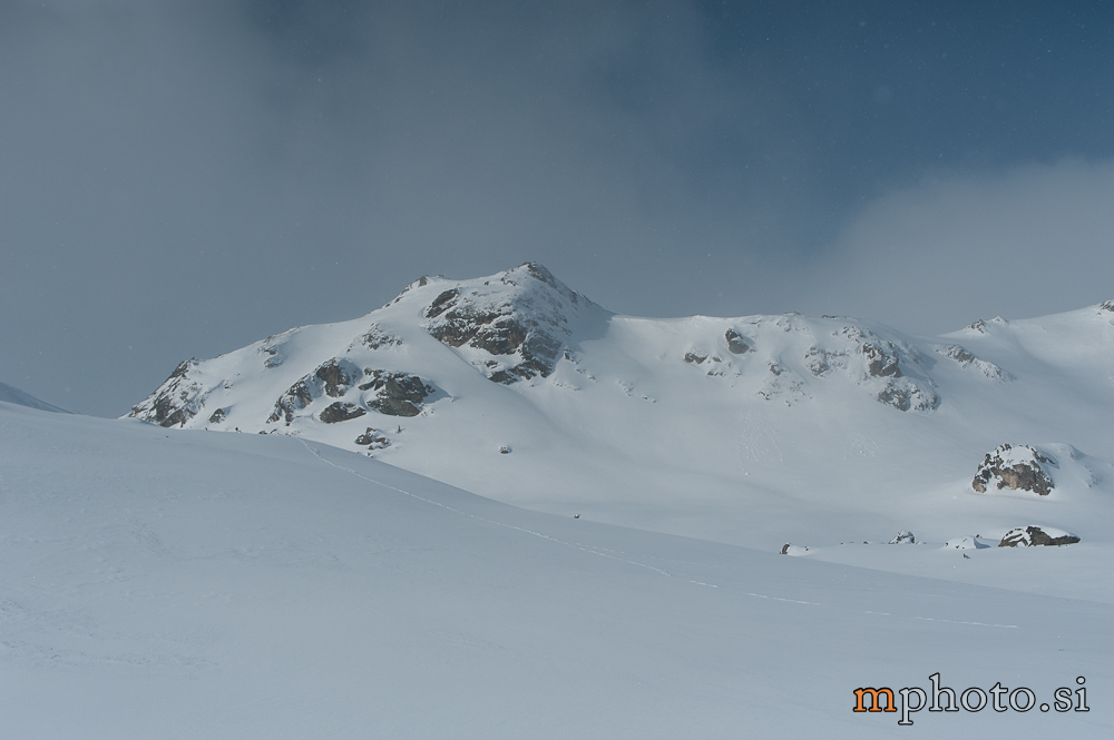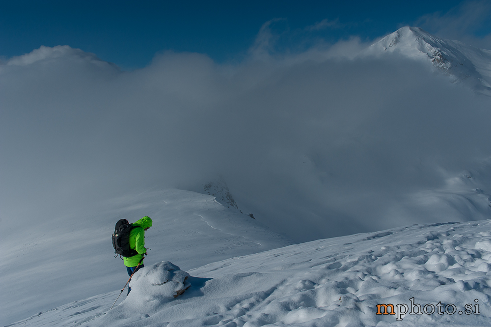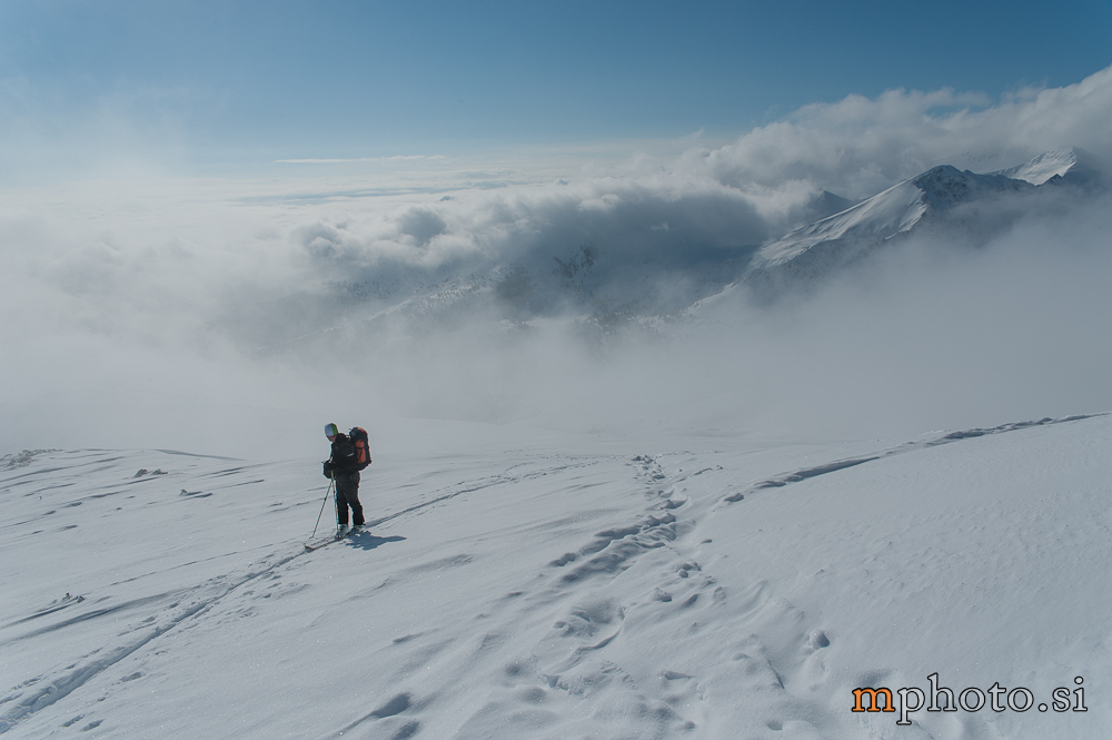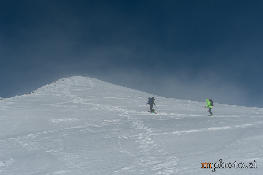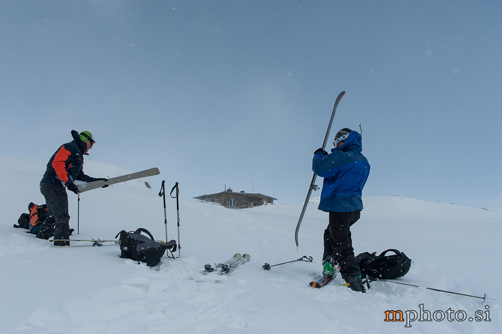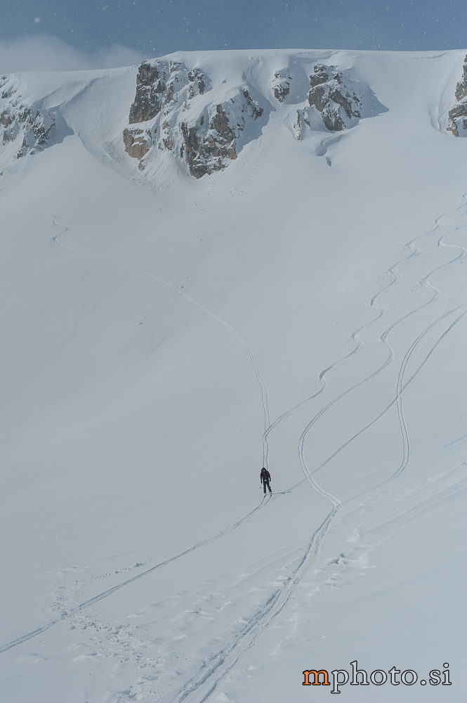Še zadnje trenutke vidljivosti izkoristimo za spust z vrha. Od spodnjega dela proti koči pa se držimo špure kot pijanec plota, da sploh najdemo kočo.