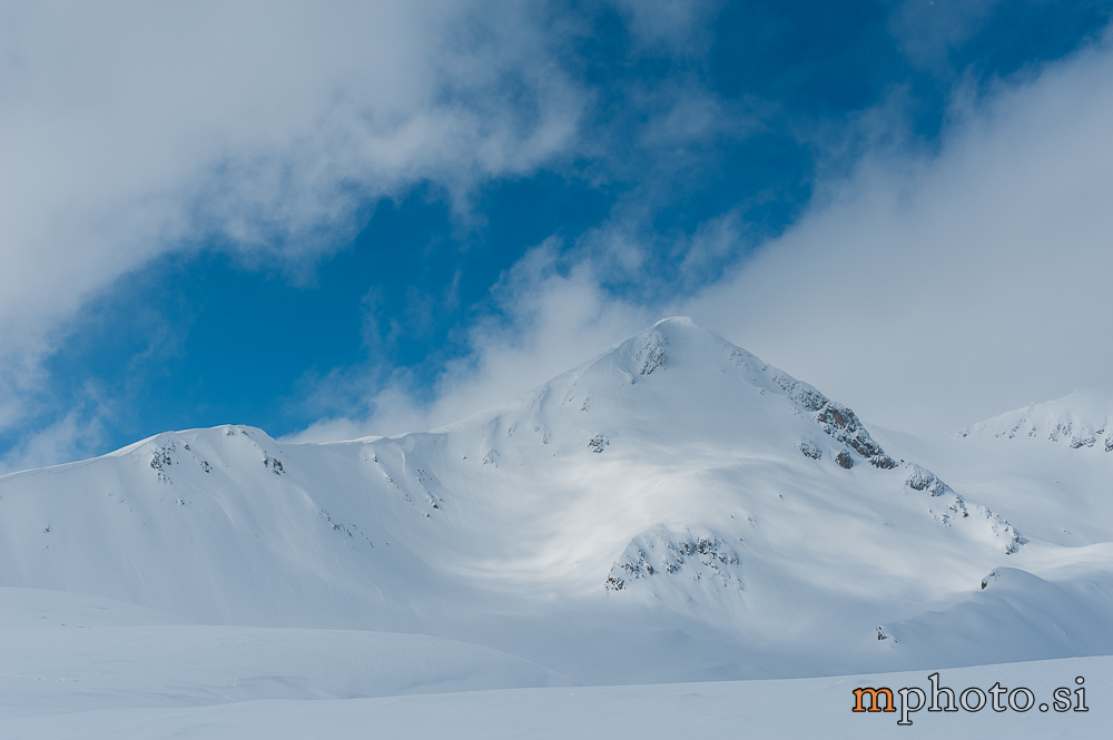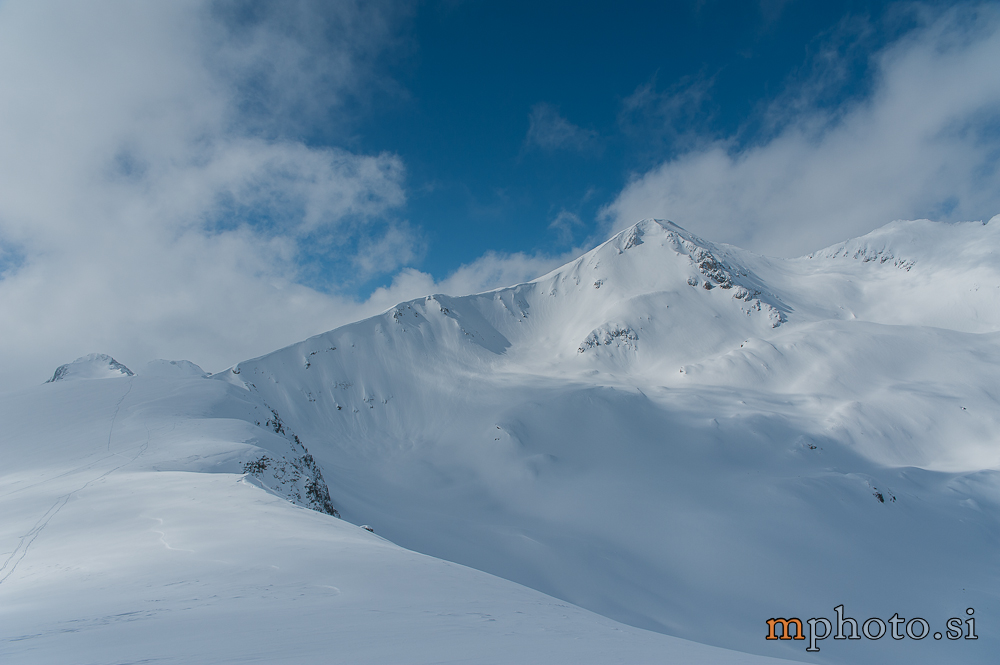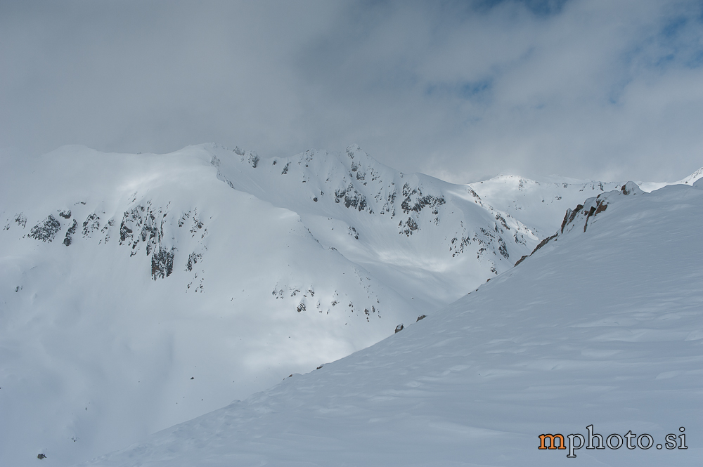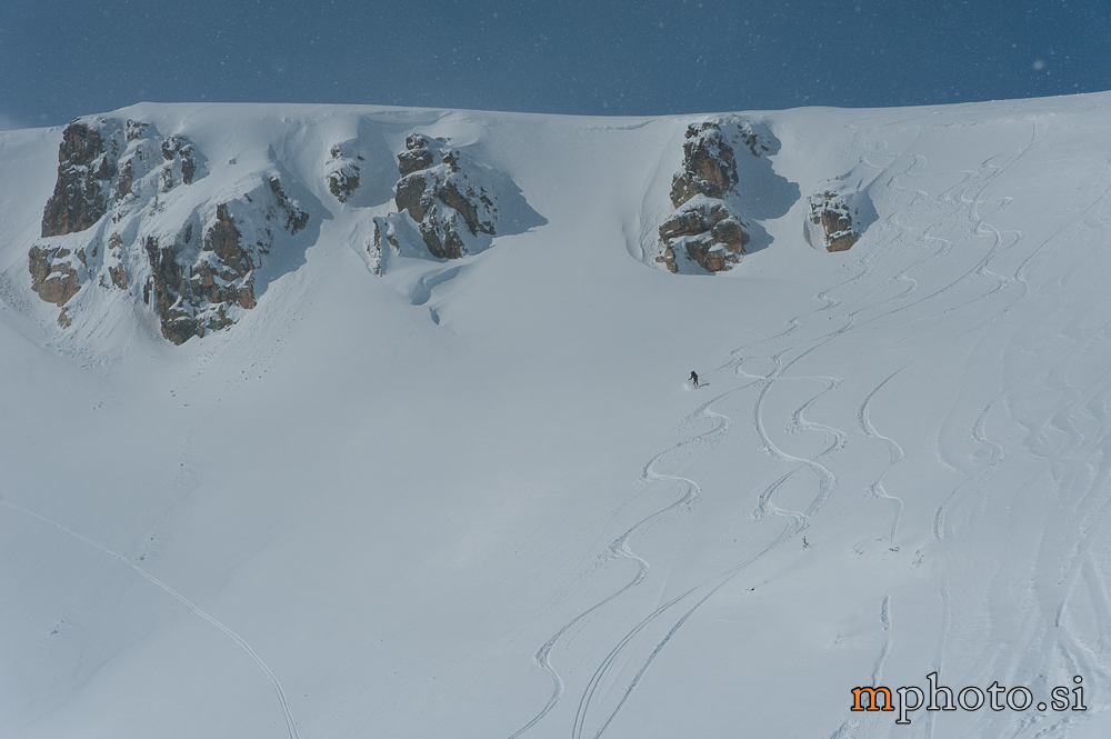 Spodaj spet nekako dobimo občutek, da se nekdo tam zgoraj pošteno dela norca iz nas. Takoj, ko smo sestopili z vrha se je nebo spet odprlo, narisali so se hribi okrog nas…nepresmučane flanke so se nam dobesedno režale v ksihte.