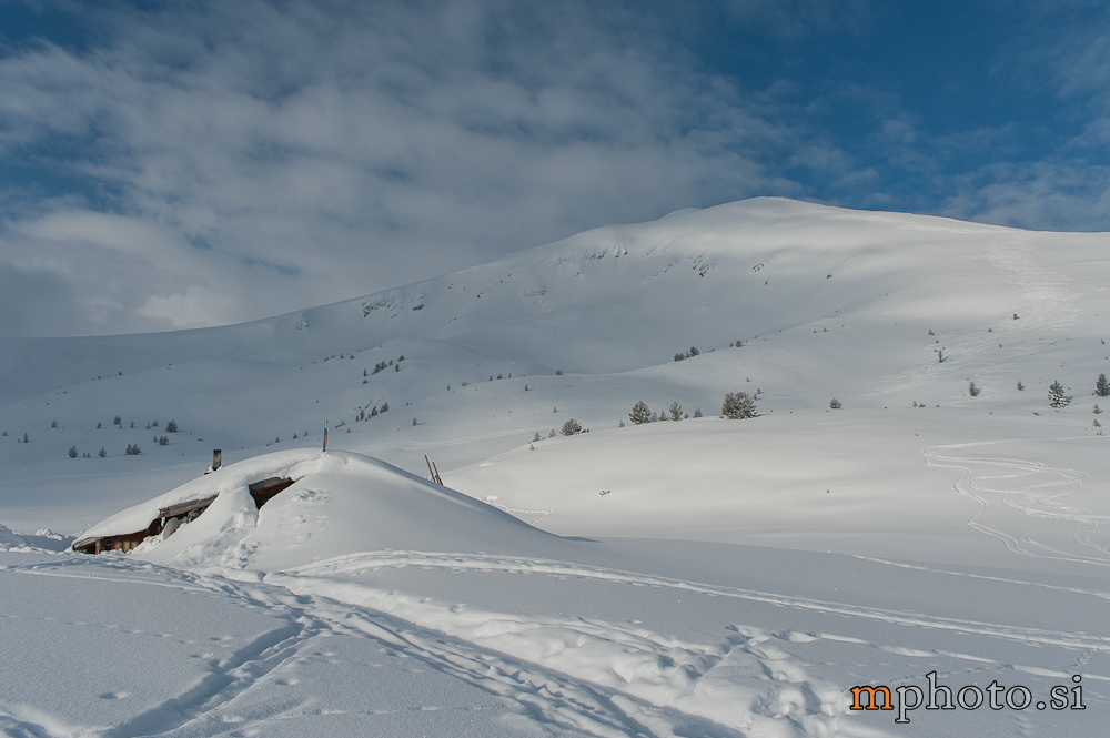 Z vrha odsmučava direktno proti koči. V vršnem delu je pod 5 cm frišnega pršiča nekaj skorje, nižje pa je vse skupaj veliko lepše smučljivo.