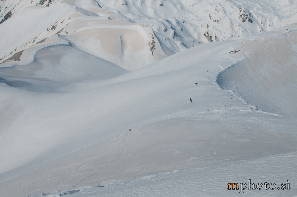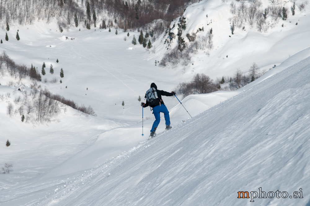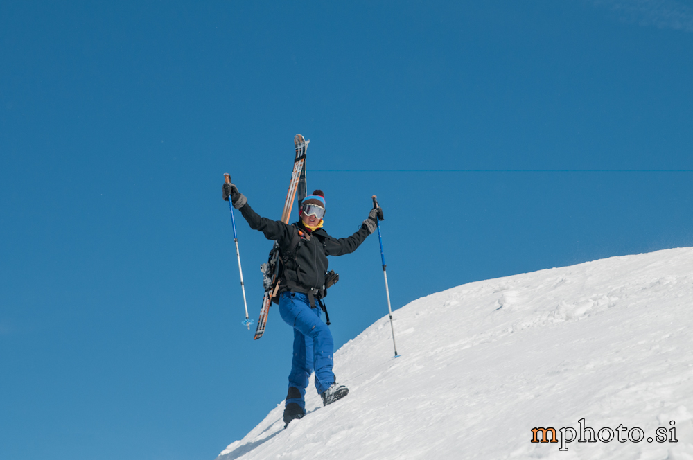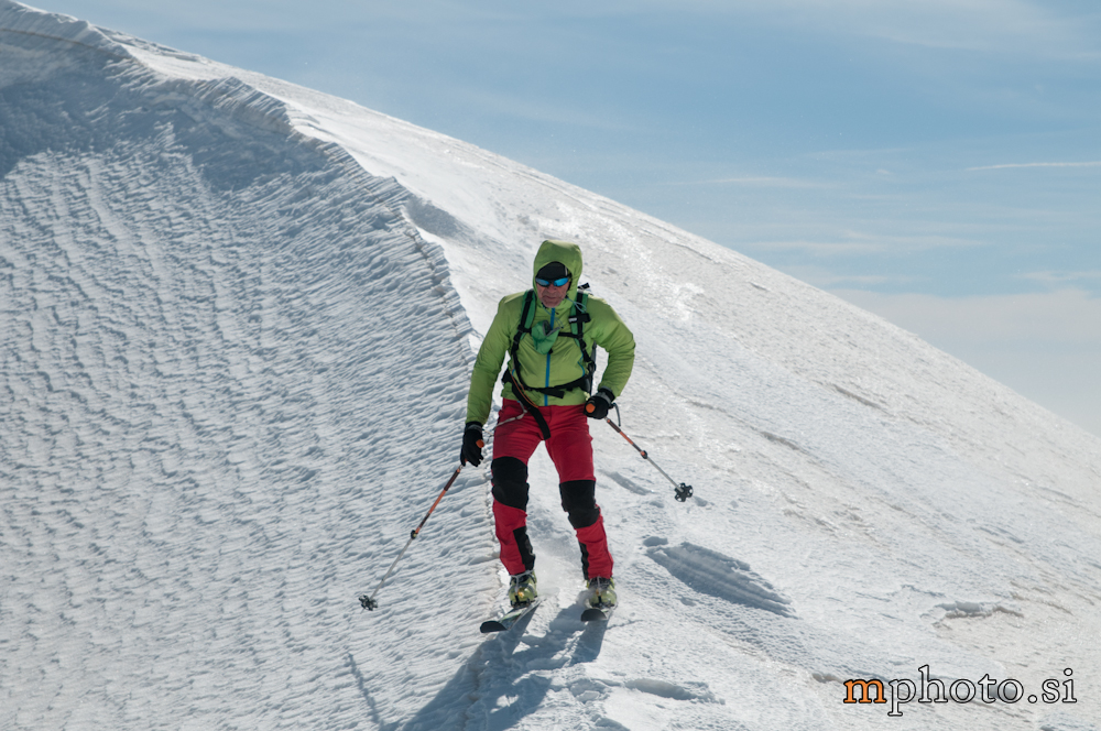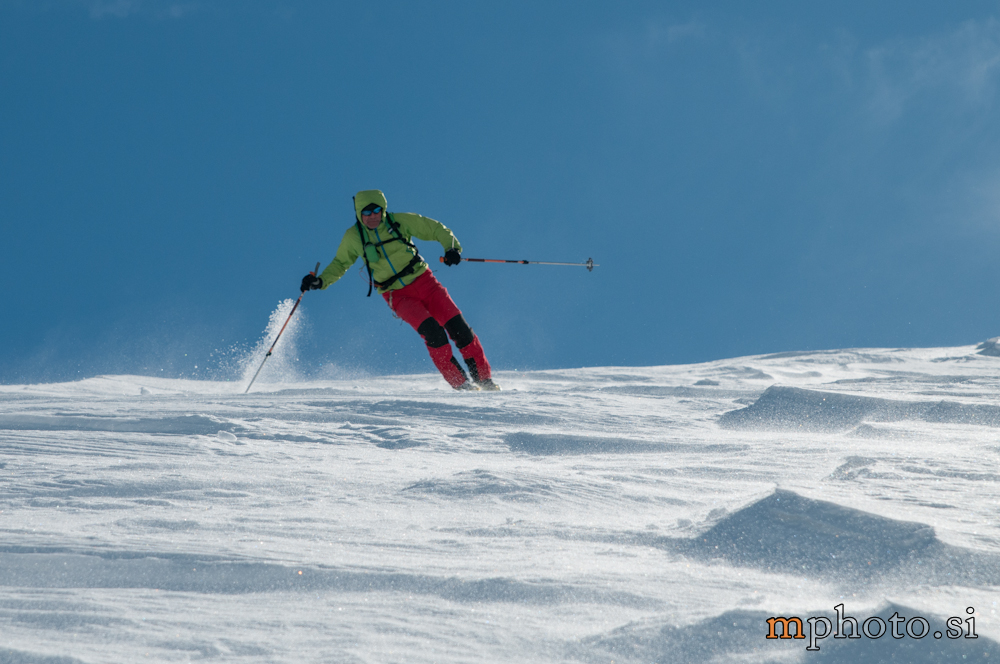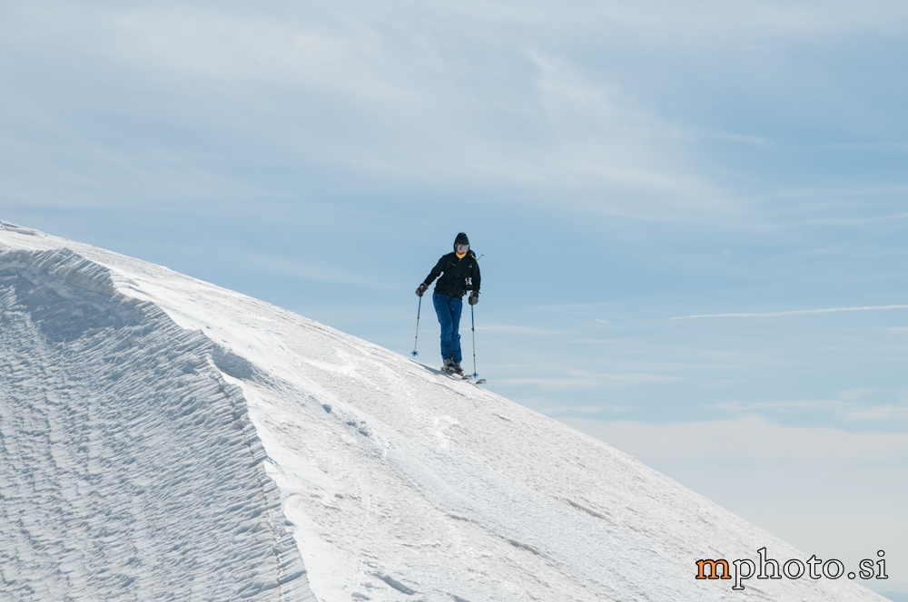 Rodica-4470Razgledava se, opremiva za spust in potegneva po zgornji flanki. Ker sta Liza in Katja še na poti navzgor jo še enkrat peš mahneva do vrha, saj je smuka v gornjem delu užitna. Tam, kjer je veter spihal gornjo plast je sneg precej trd, kjer pa je napihanček so zavoji prav uživaški. Zavoljo močnega vetra sonce ni kaj dosti odjenjalo trde podlage v zgornjem delu. V nižjih predelih se tudi ta trd sneg spremeni v lepo smučljivega.