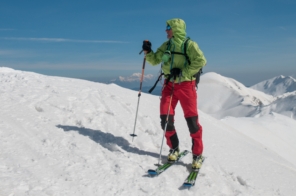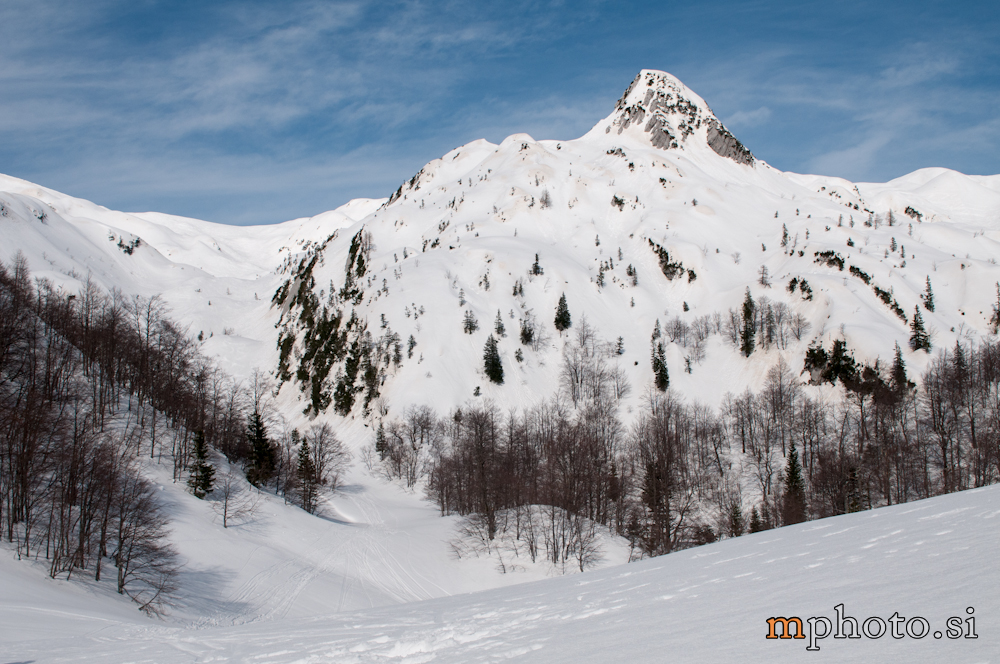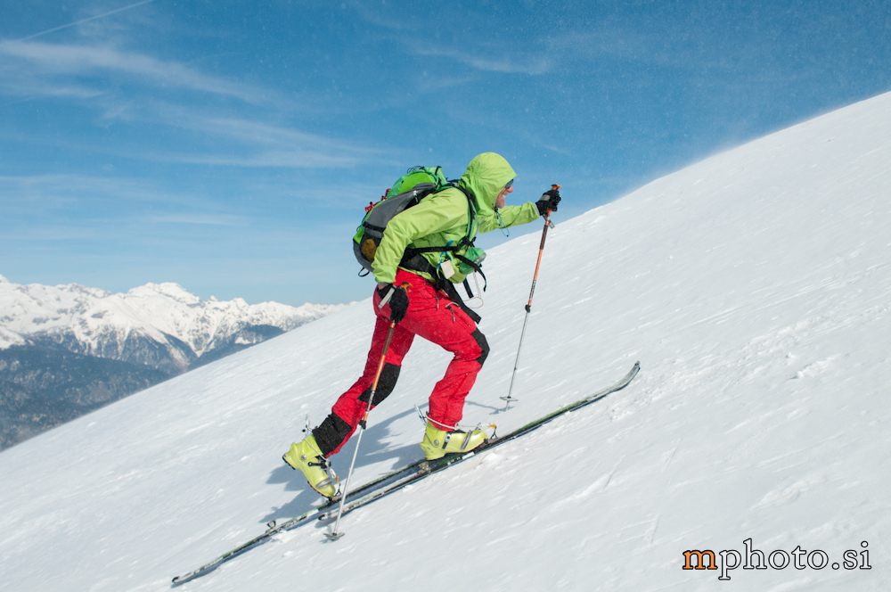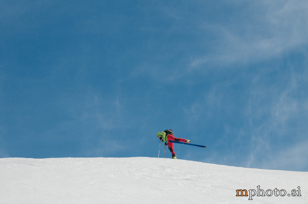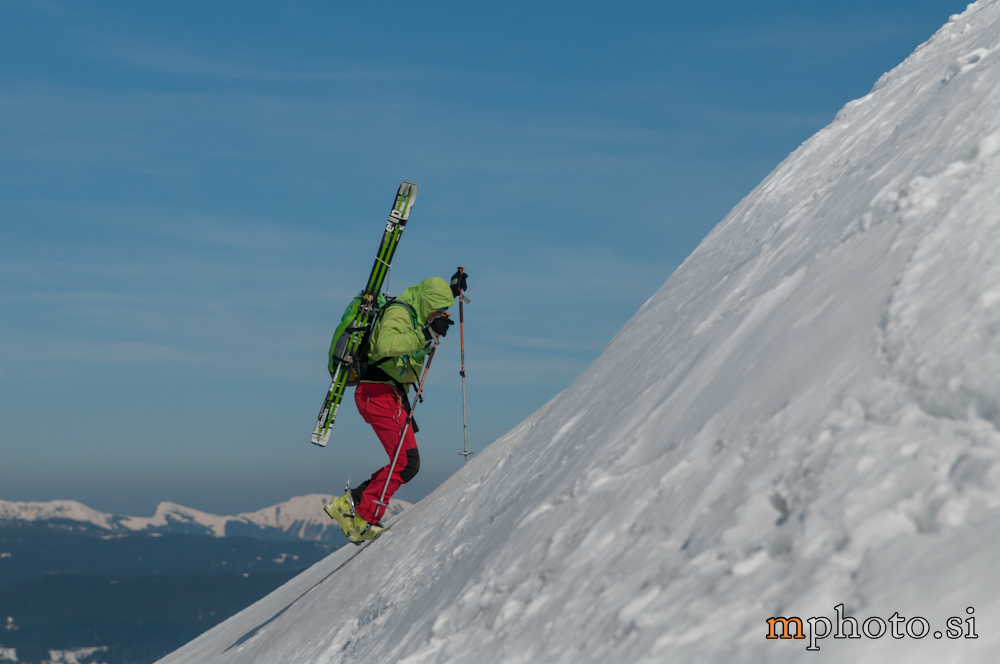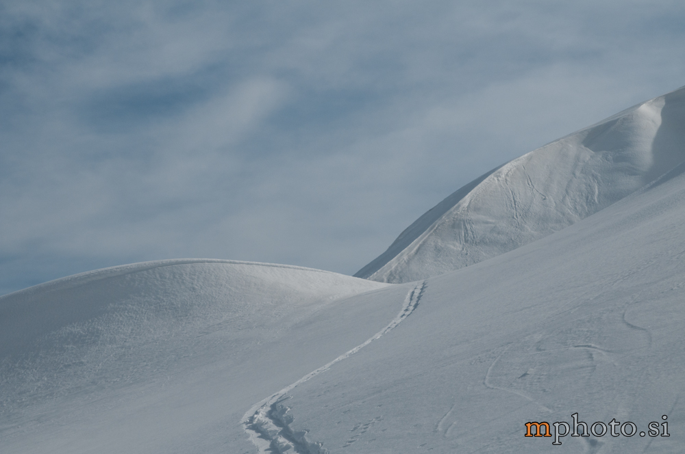 Rodica-4470Razgledava se, opremiva za spust in potegneva po zgornji flanki. Ker sta Liza in Katja še na poti navzgor jo še enkrat peš mahneva do vrha, saj je smuka v gornjem delu užitna. Tam, kjer je veter spihal gornjo plast je sneg precej trd, kjer pa je napihanček so zavoji prav uživaški. Zavoljo močnega vetra sonce ni kaj dosti odjenjalo trde podlage v zgornjem delu. V nižjih predelih se tudi ta trd sneg spremeni v lepo smučljivega.