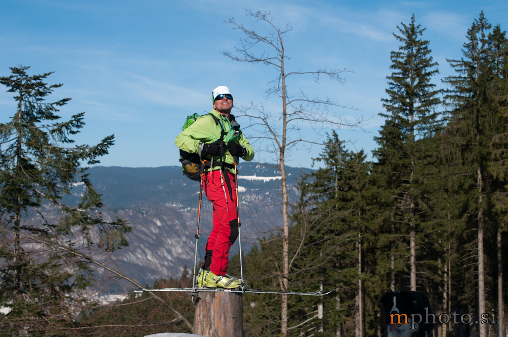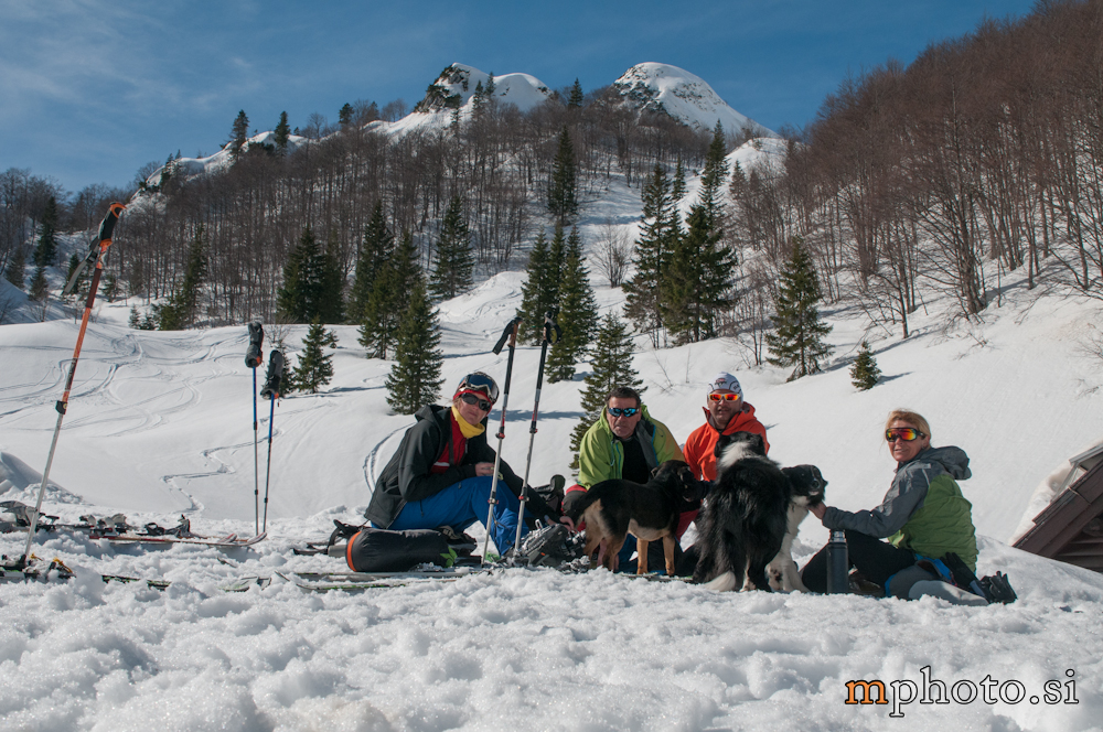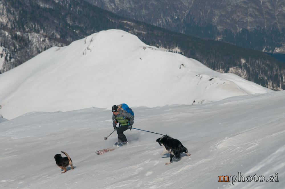 Lepo vreme ne pojenja, snega pa je tudi še v izobilju. Zato ni problem najti nekaj somišljenikov in izkoristiti sončen dan. Nekaj pred deveto smo na sppdnji postaji gondolske žičnice pod Voglom. Liza s pasjo vprego, Katja, Stojan in jaz. Liza gre naprej, z gondolo na Vogel, nato pa ob pomoči treh pridnih kosmatincev proti Konti, mi pa s sedežnico in vlečnico za njo. Sledi uživaški spust proti planini Suha. Rodica-4378